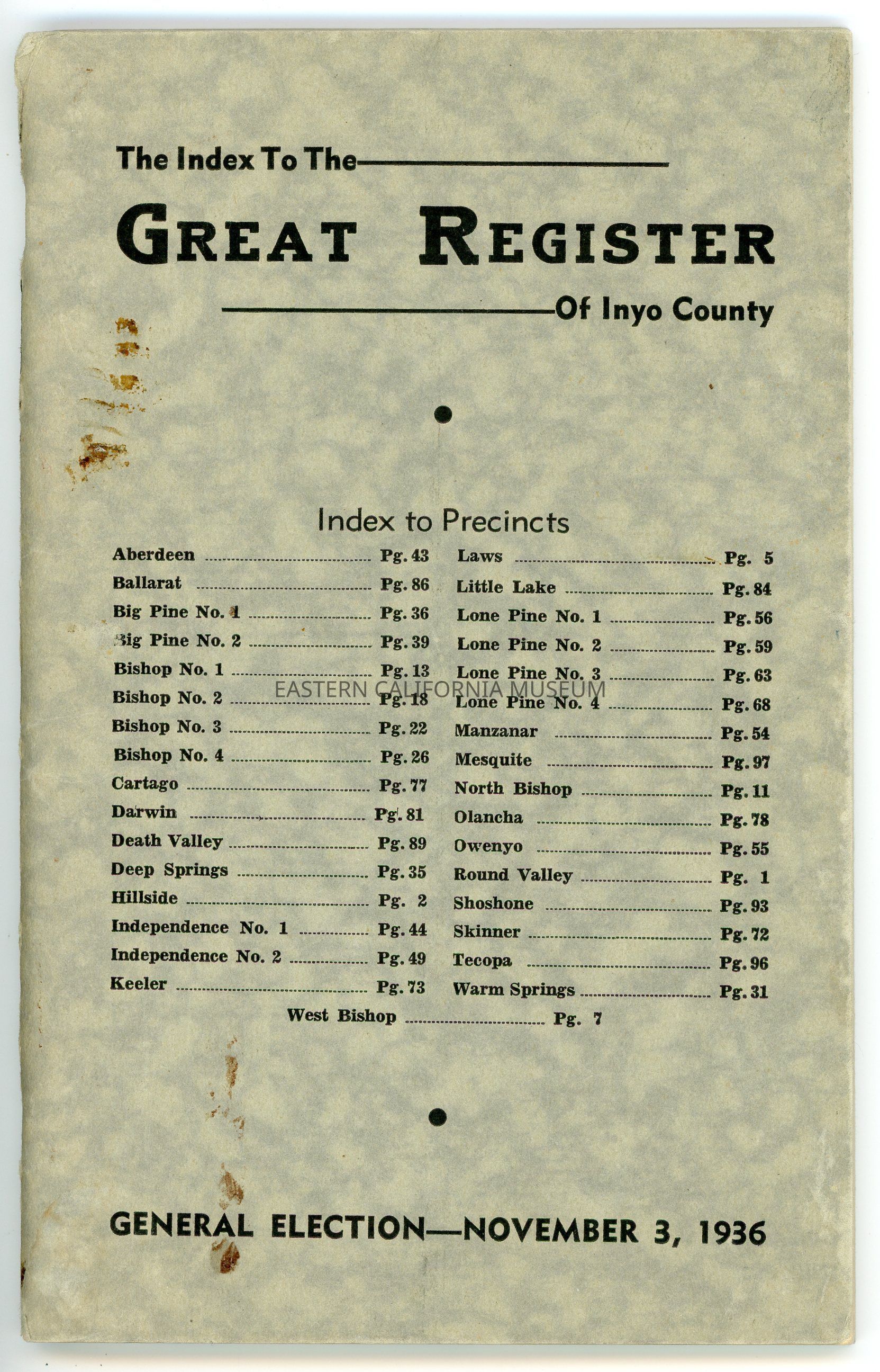 Index to the Great Register of Inyo County, General Election, November 3, 1936.Publication Details