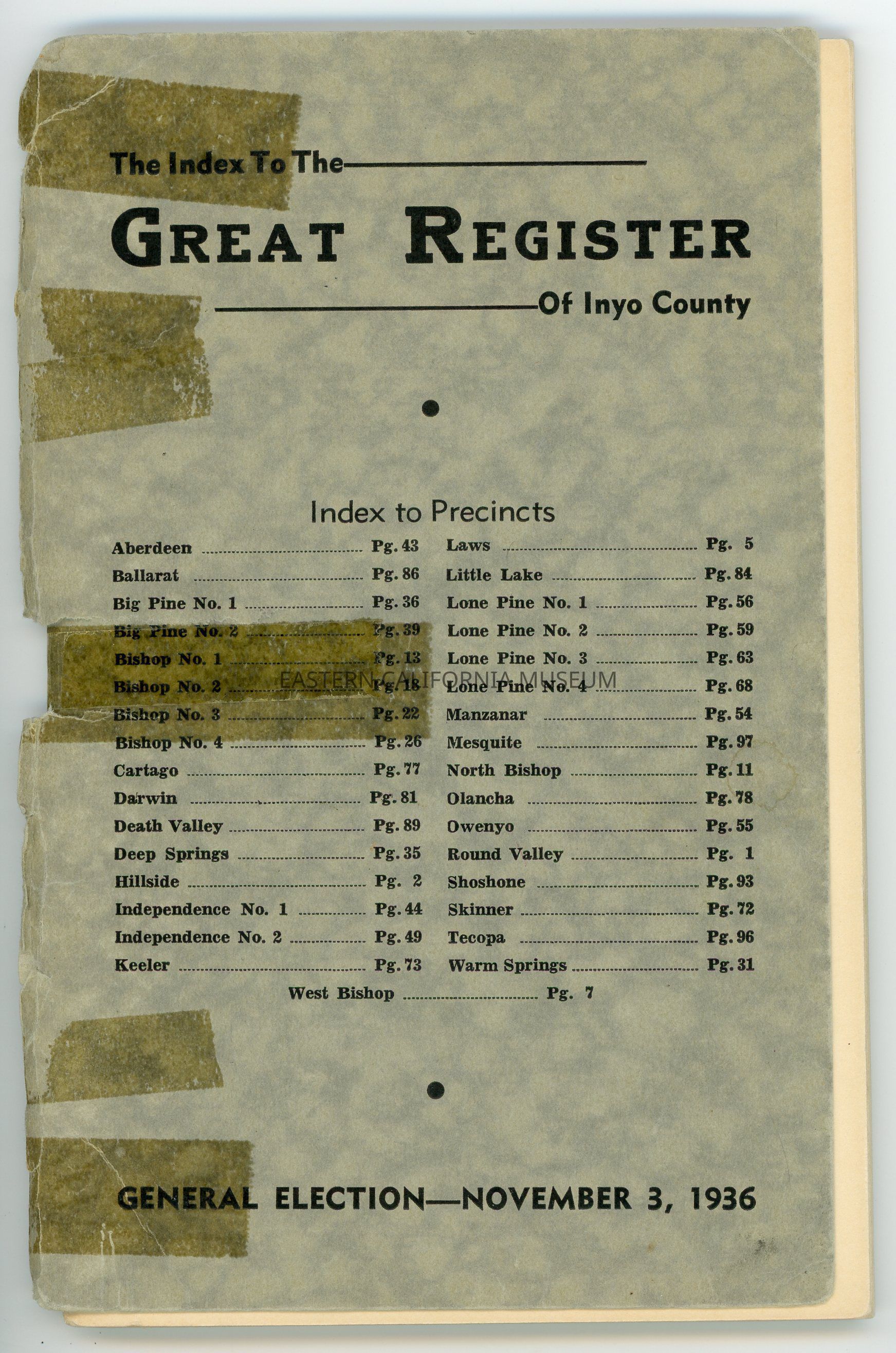 Index to the Great Register of Inyo County, General Election, November 3, 1936Entry/Object ID