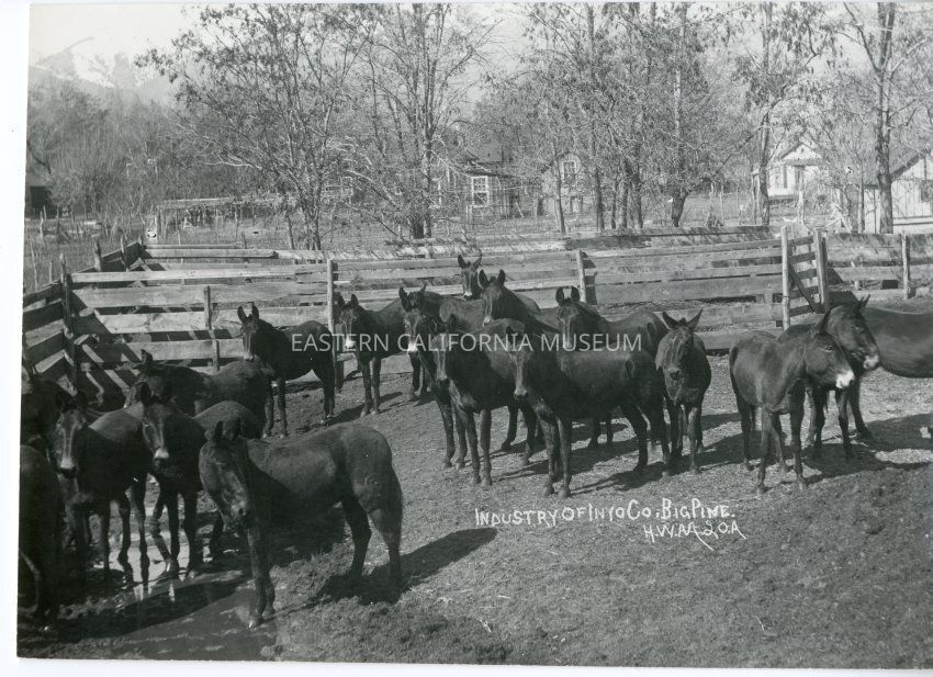 B&W. Front is labeled, "H.W.M. 20A Industry of Inyo Co. Big Pine." Shot of a corral with horses/donkeys/mules. Homes, trees, and Sierra Nevada in background.