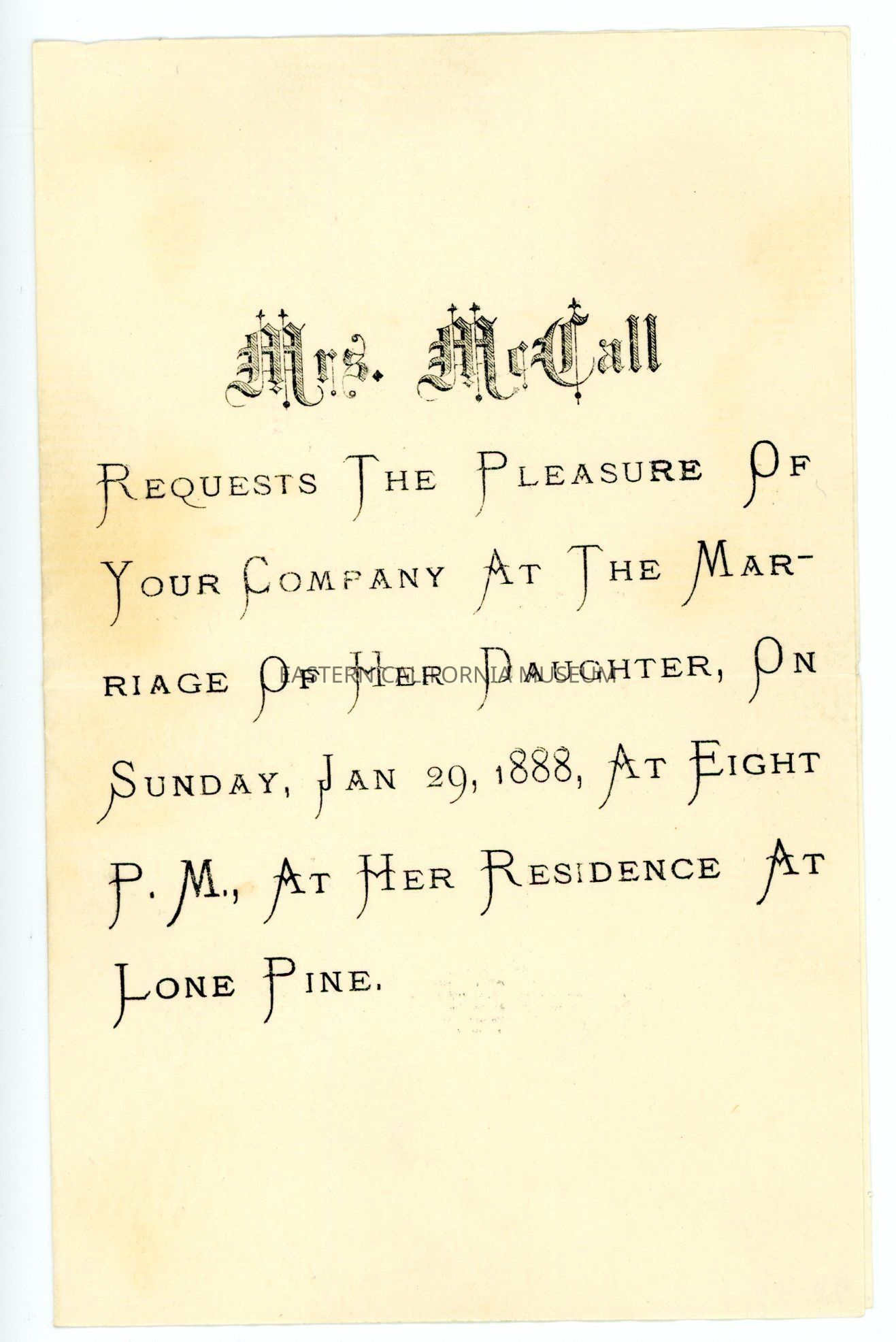 Wedding invitation: "Mrs. McCall requests the pleasure of your company at the marriage of her daughter, on Sunday, Jan. 29, 1888, at eight P.M. at her residence at Lone Pine."Collection
