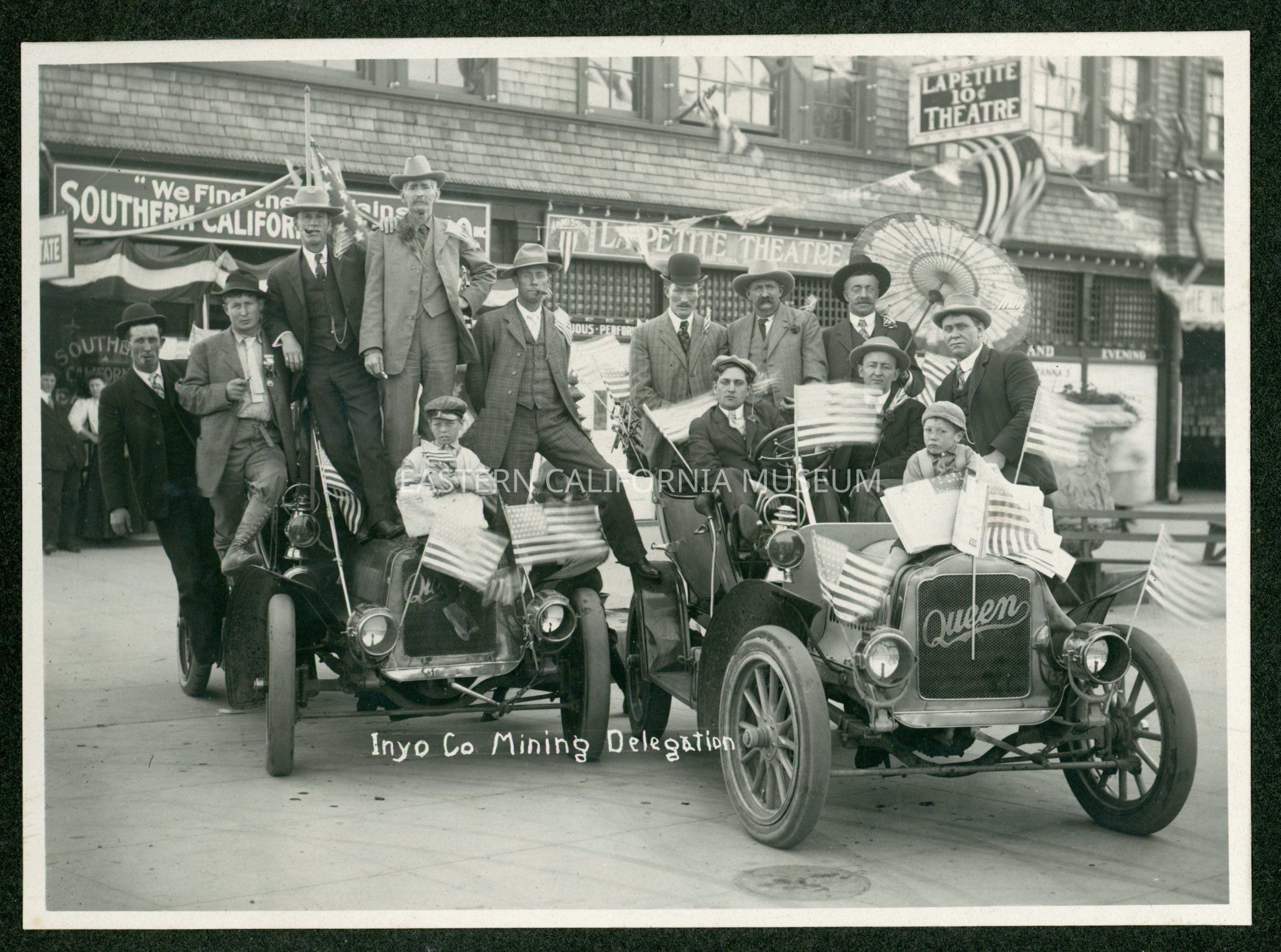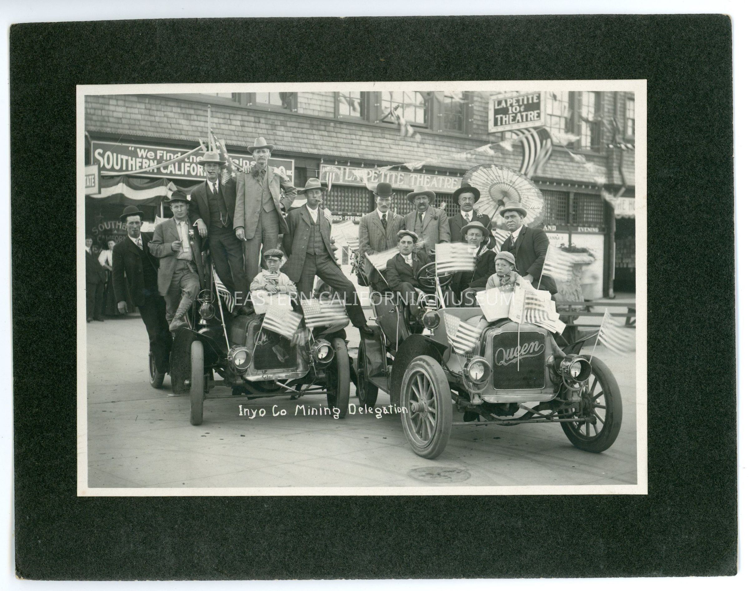 Mounted photo titled, "Inyo Co. Mining Delegation" showing two Queen vehicles loaded with thirteen men (two are young boys). The vehicles are festooned with flags. The La Petite Theatre is in the background as well as an advertisement for something regarding Southern California.Collection