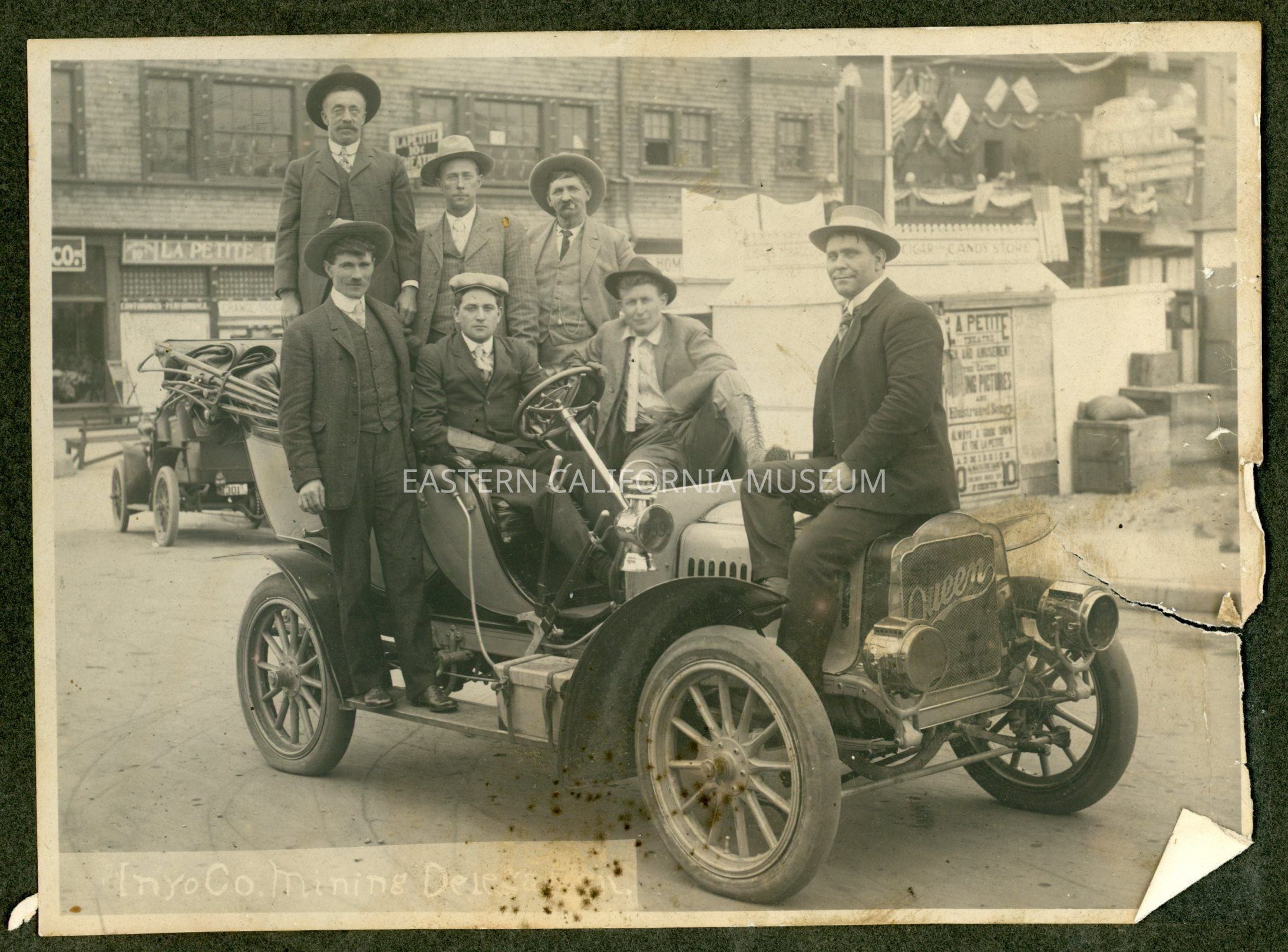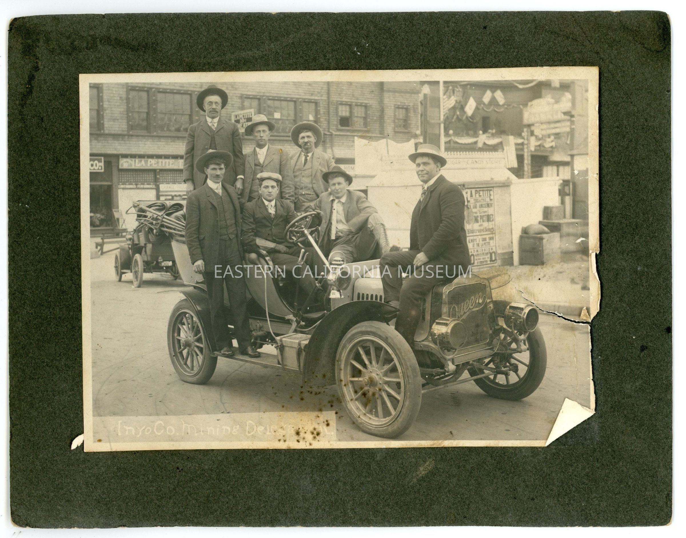 Mounted photo titled, "Inyo County Mining Delegation" showing a group of seven men sitting on a Queen automobile. They are in the middle of a city, with lots of stores and advertisements around them. The La Petite Theatre may be directly behind them.Collection