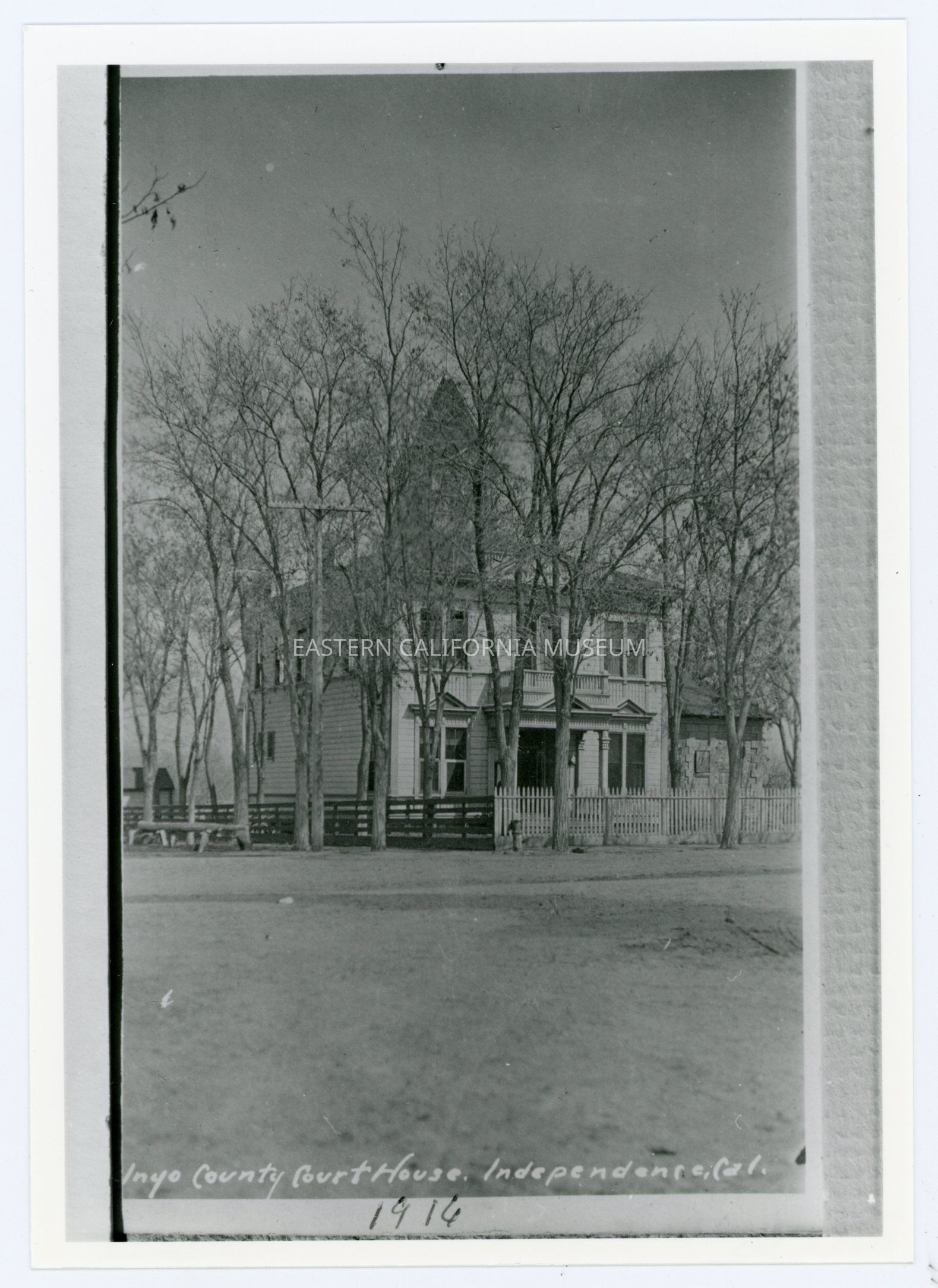 Copy of a photo titled, "Inyo County Court House, Independence, Cal." of the third Inyo County Courthouse surrounded by trees. Below the original image someone has written "1916."Photograph Details