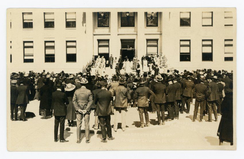 Handwritten in ink on reverse: In front of courthouse in Independence for Memorial services of the first World War.Collection