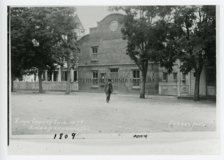 Copy of a photo titled, "Inyo County Jail, Independence, Cal." by photographer A. A. Forbes and given his ID #1079. Someone has written "1909" on the bottom of the photo. There is a man walking in front of the building in the dirt street. The third Inyo County Courthouse is barely visible behind the trees to the left.Photograph Details