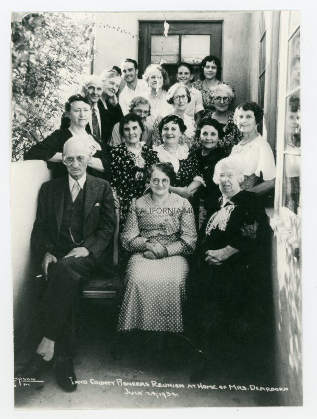 Copy of a photo of a large group of people. It is titled, "Inyo County Pioneers Reunion at Home of Mrs. Dearborn, July 24, 1934." The photographer's information has been partially cut off, but another copy of the print confirms it is Thompson of Santa Monica, CA.