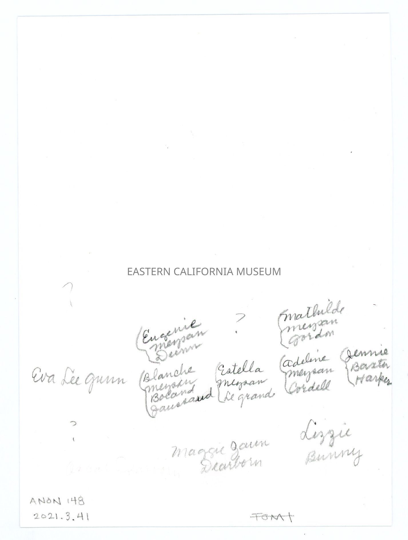 Some of the people have been identified in pencil on the reverse and they include: Eva Lee Gunn, Eugenie Meysan Dunn, Mathilde Meysan Gordon, Blanche Meysan Boland Jaussaud, Estella Meysan LeGrande, Adeline Meysan Cordell, Jennie Baxter Harper, Maggie Zaun Dearborn, and Lizzie Bunny.Made/Created