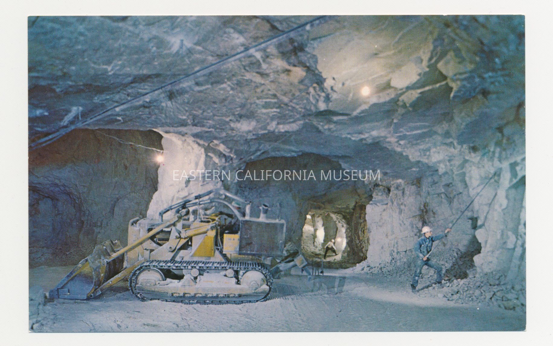 Color photo postcard of the interior of a mine with heavy equipment and two miners at work.