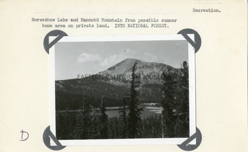 B&W glossy print: mounted on card stock with decorative corners Horseshoe Lake and Mammoth Mountain from possible summer home area on private land.
