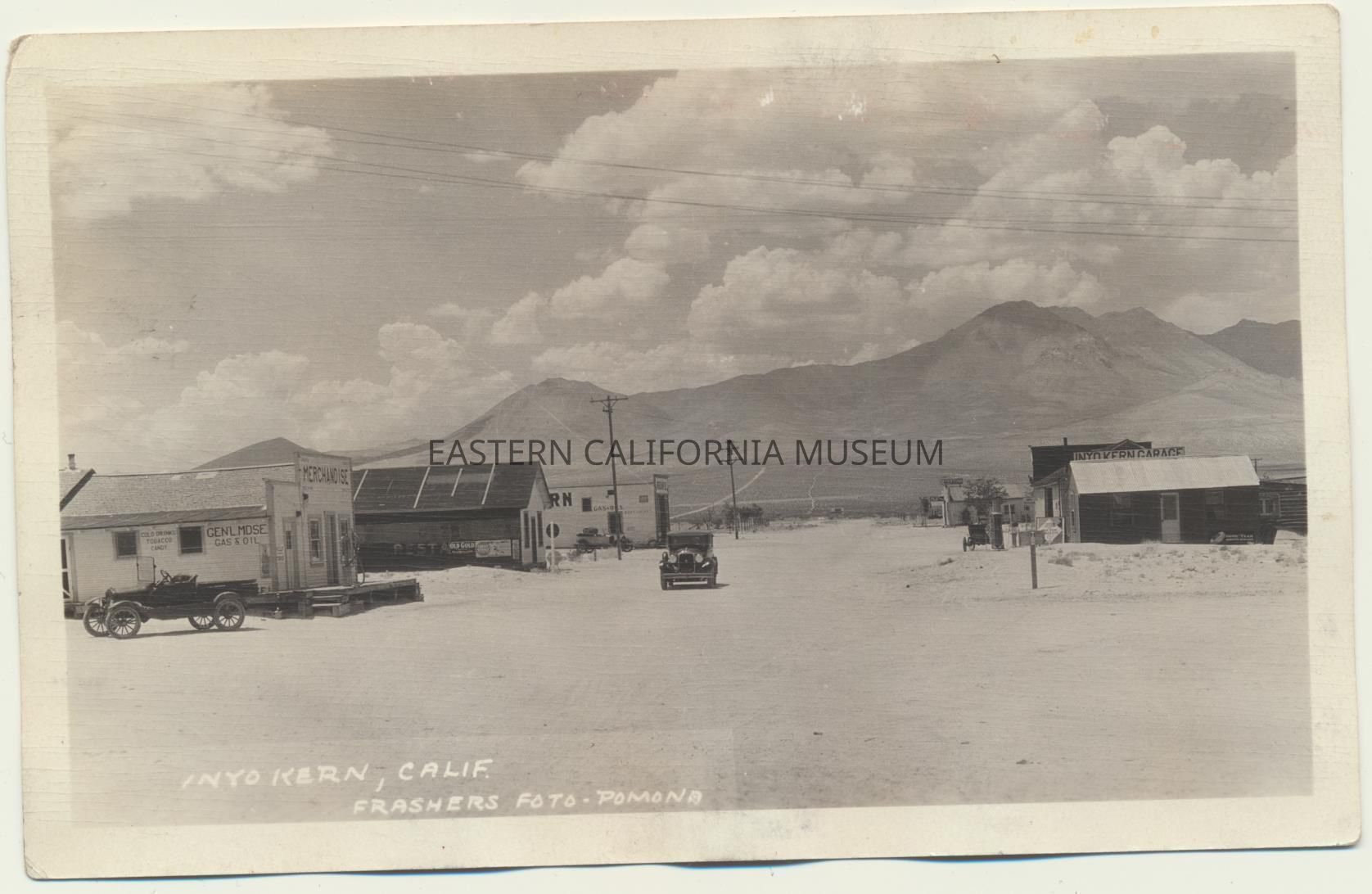 Photo postcard titled, "Inyokern, Calif." taken by photographer Burton Frasher of Pomona. It shows a General Merchandise store and Inyokern Garage. There is an early vehicle driving down the middle of the dirt street towards the camera.Photograph Details