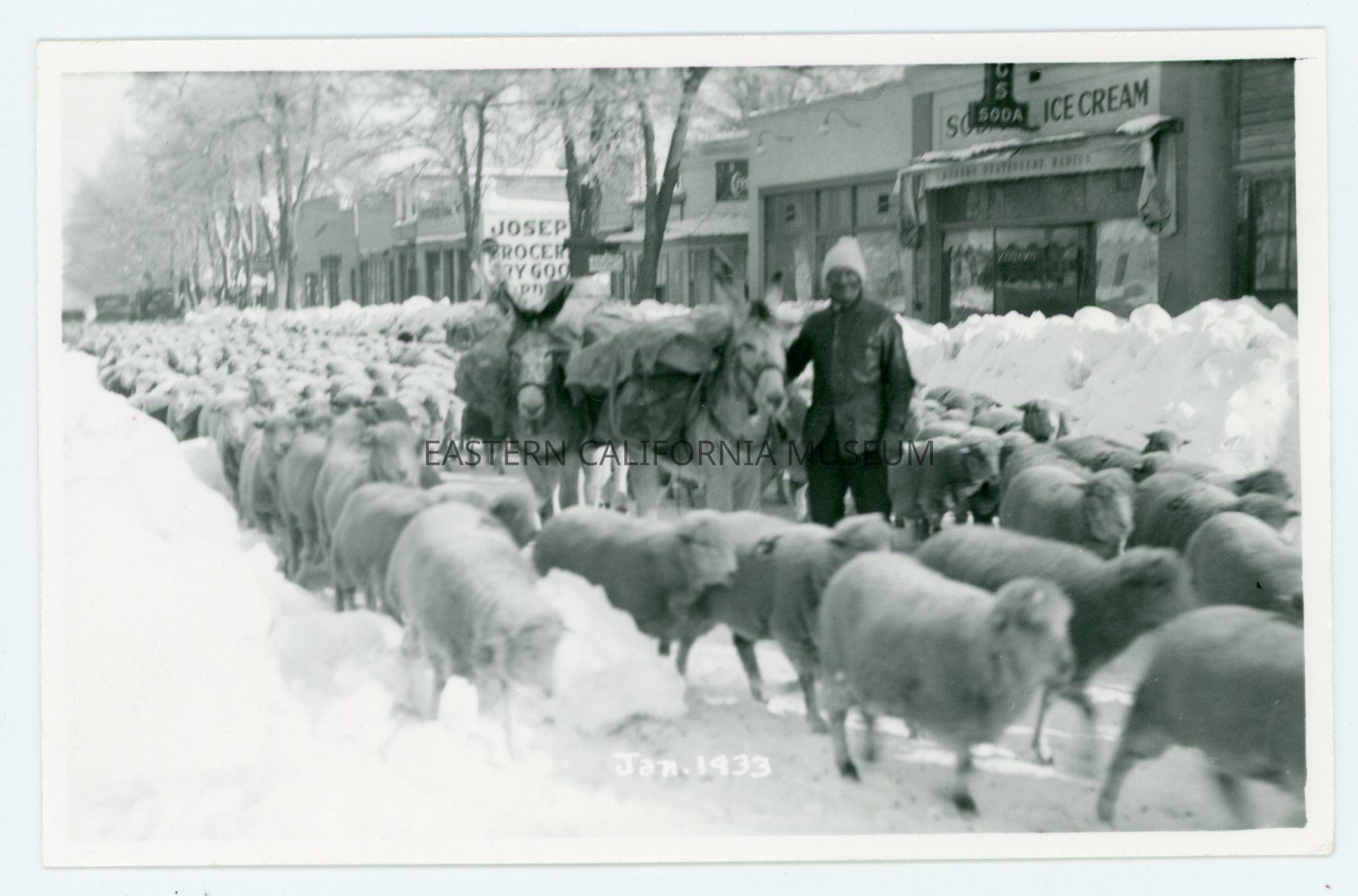 Photo postcard titled "Jan. 1933" taken by Harry W. Mendenhall. It shows a flock of sheep walking through the Main Street of Big Pine after a big snow storm. A man with two laden pack mules or donkeys in in the center. Visible in the background are a soda and ice cream shop as well as Joseph's store (groceries, dry goods, etc.).Photograph Details