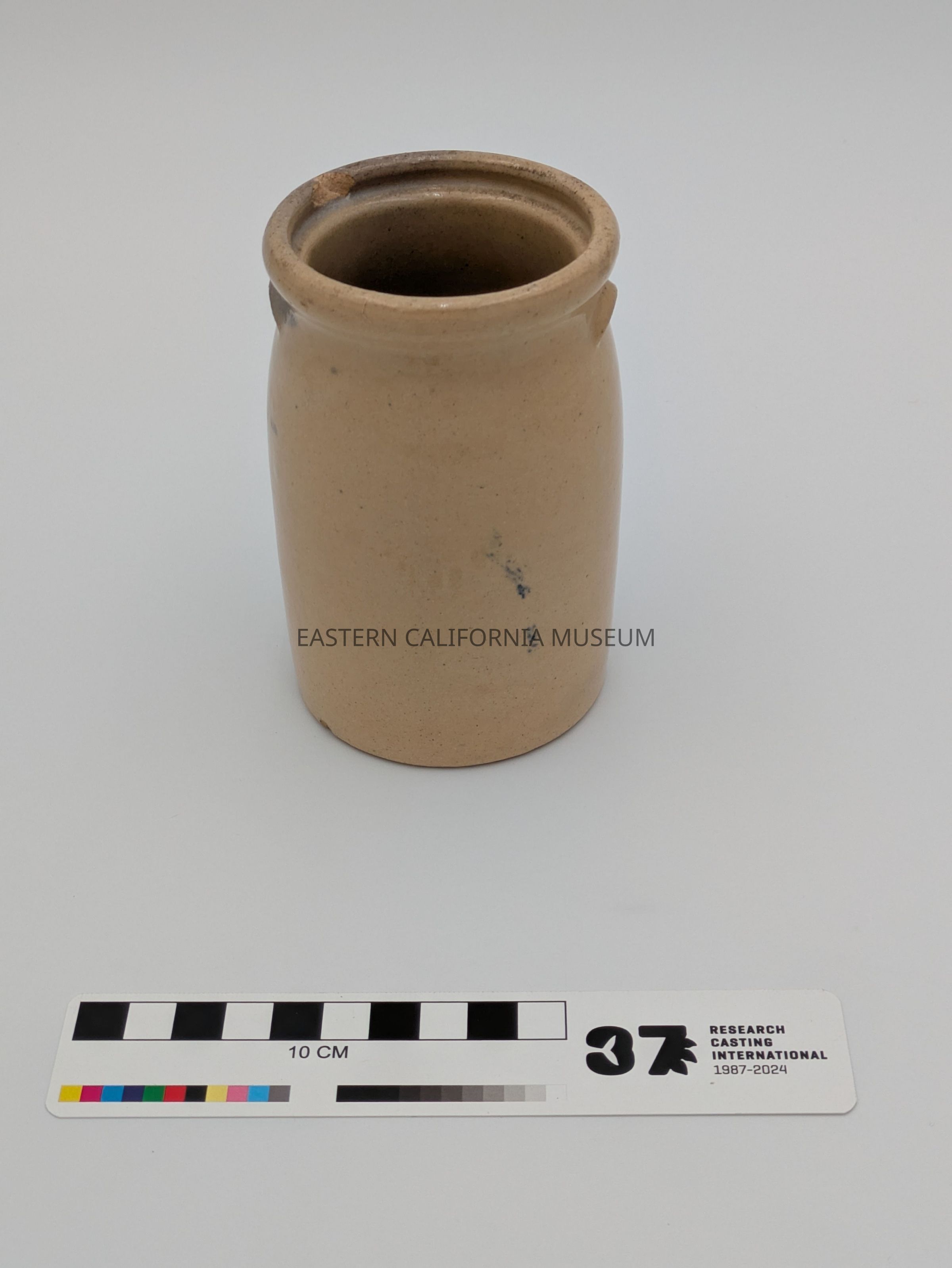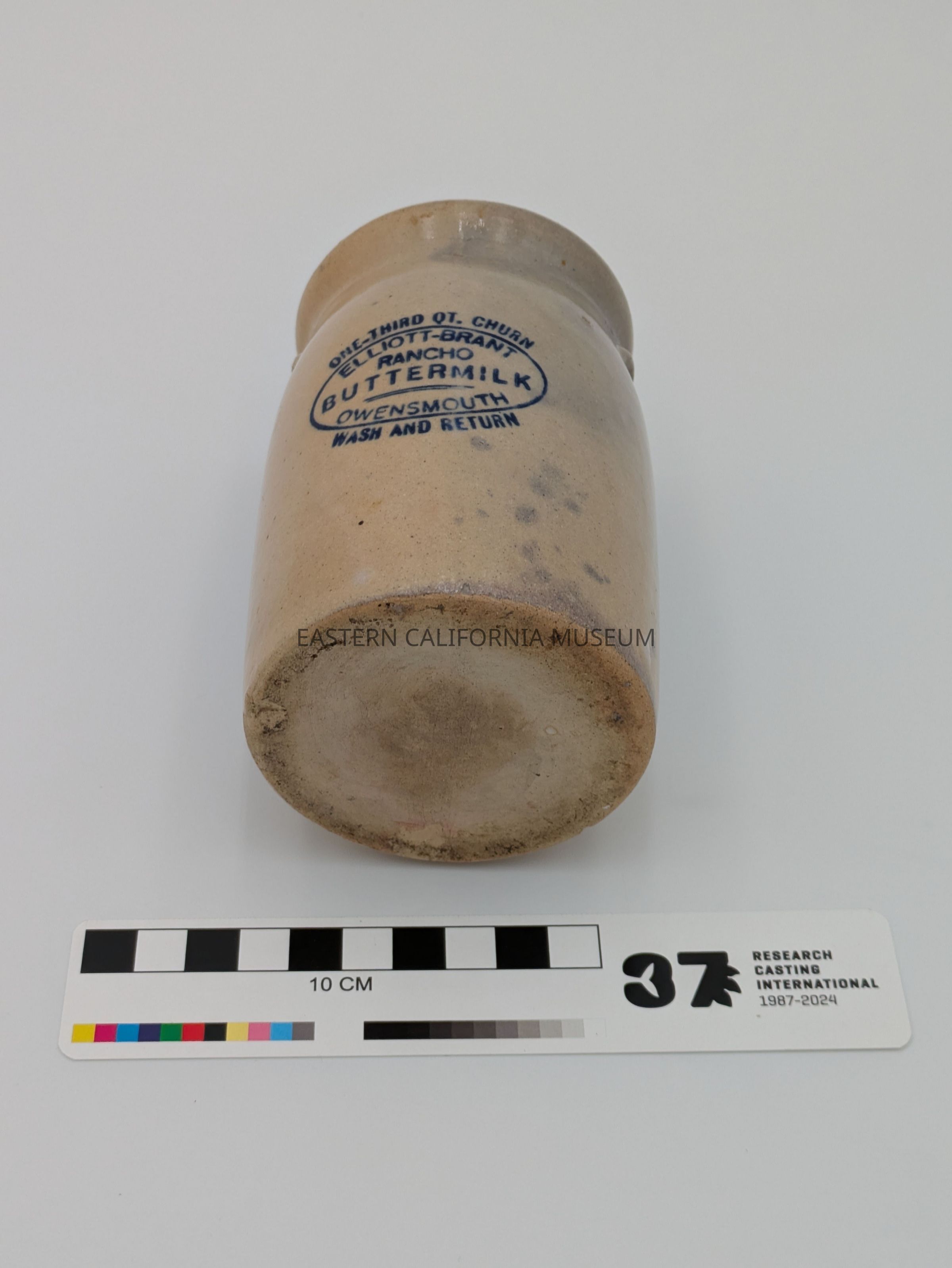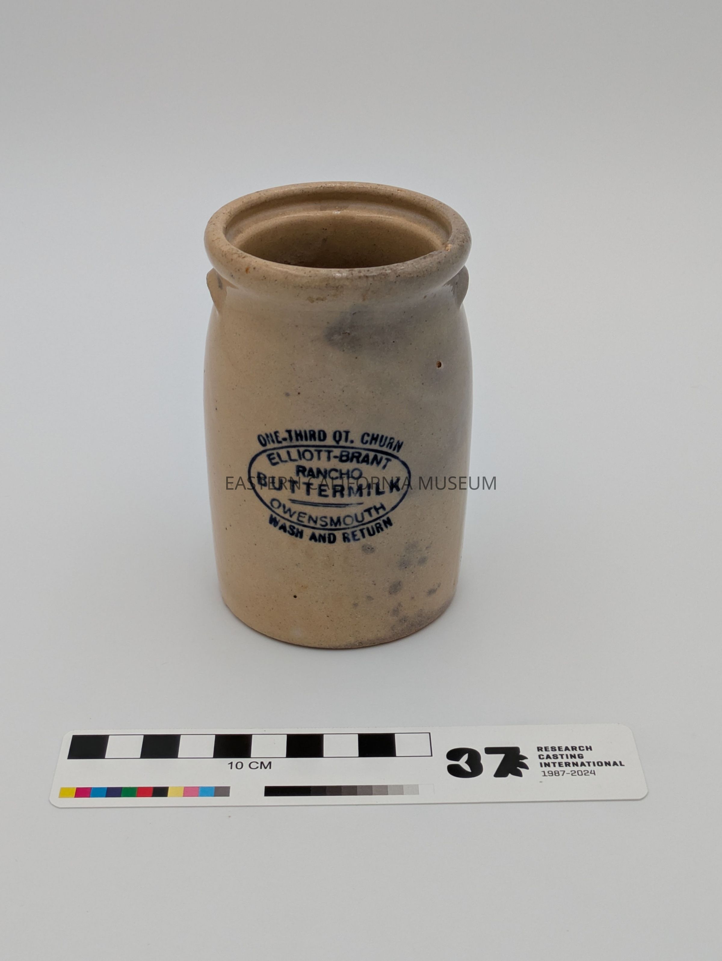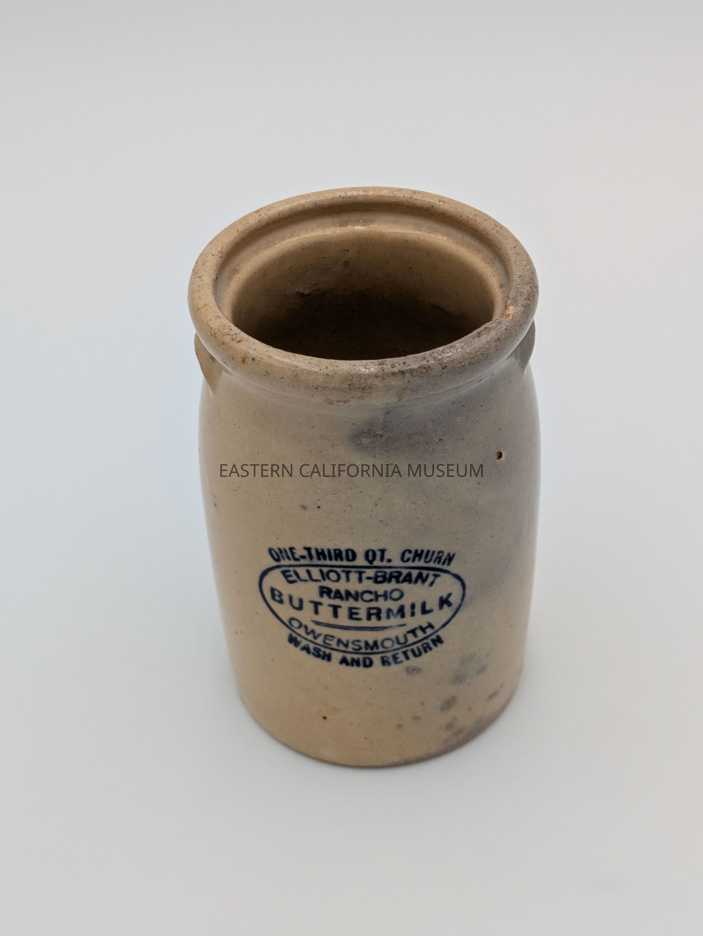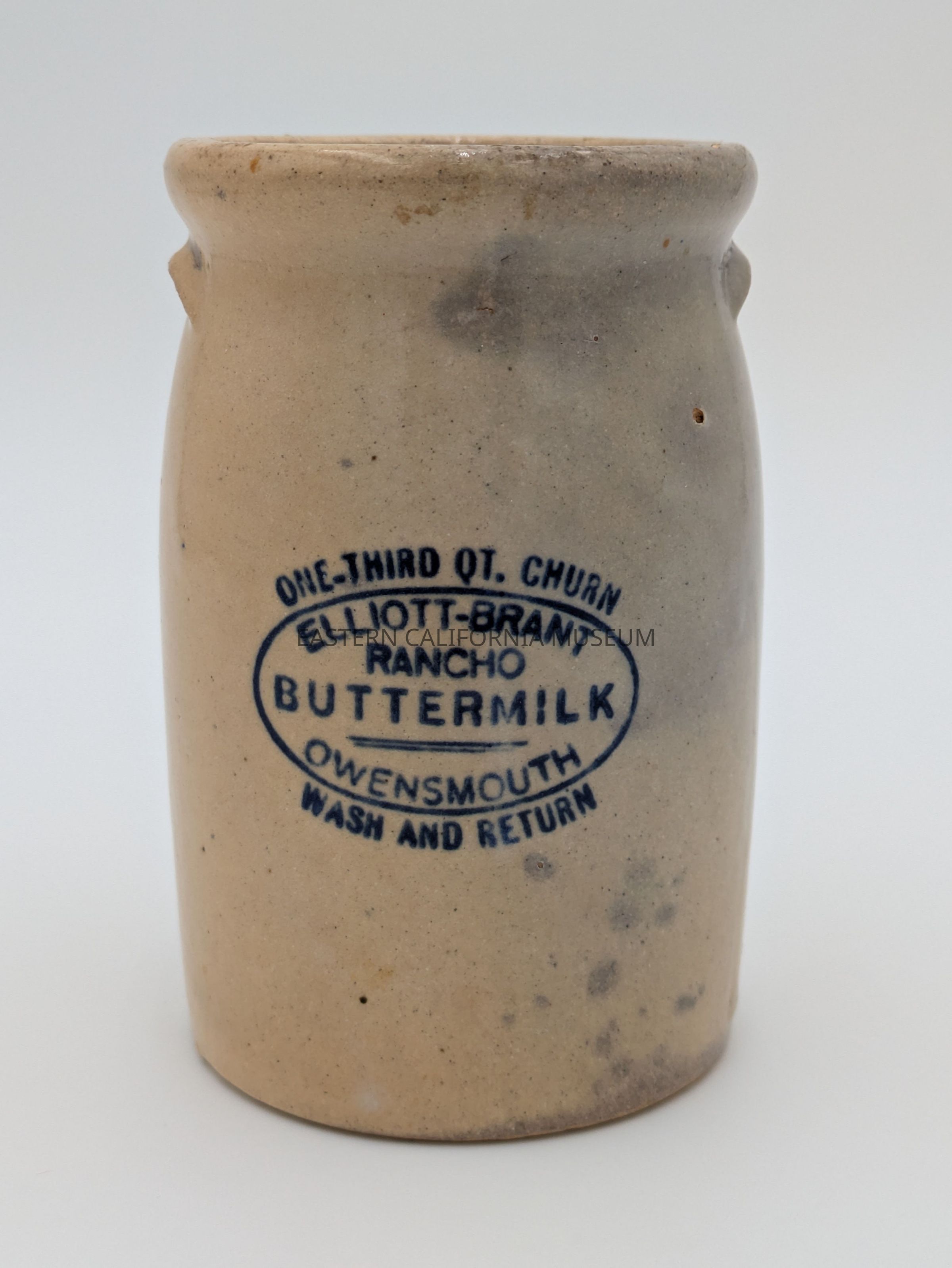 Small glazed crockery jar with "One-Third Qt. Churn / Elliott-Brant Rancho Buttermilk / Owensmouth / Wash and Return" in blue.
