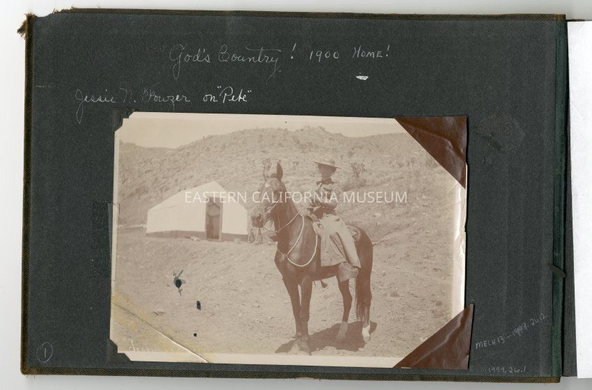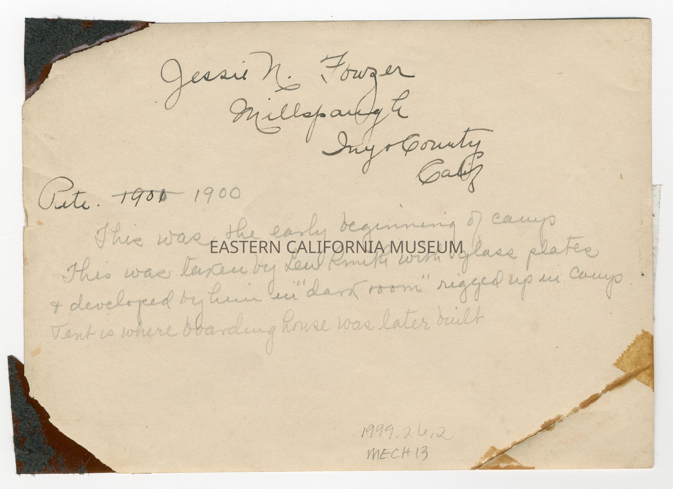Written in black ink on reverse: Jessie N. Fowzer, Millspaugh, Inyo County, Calif. Pete 1901 [date is crossed out and replaced with 1900].