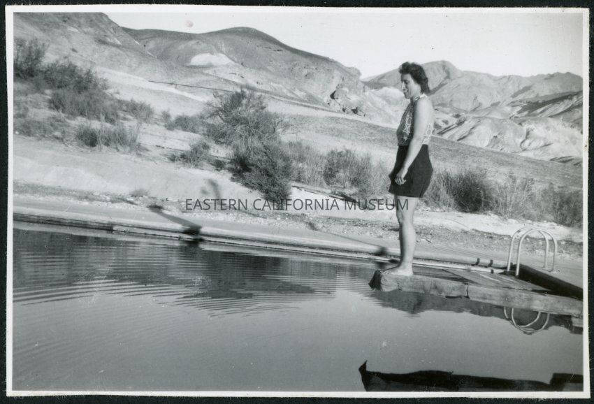 Photograph of L. Josephine Hawes standing on a diving board on New Year's Day in Death Valley National Park. Scrub brush and a mountain line can be seen in the background.Collection