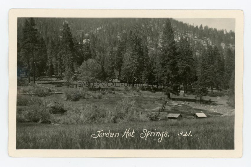 Photo postcard titled, "Jordan Hot Springs. 321." Shows some buildings, fences, fields, and trees.