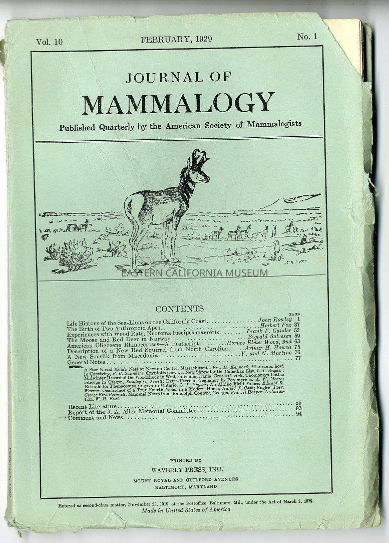 "Journal of Mammalogy, Vol. 10, No. 1, February 1929" has a detached cover.Publication Details