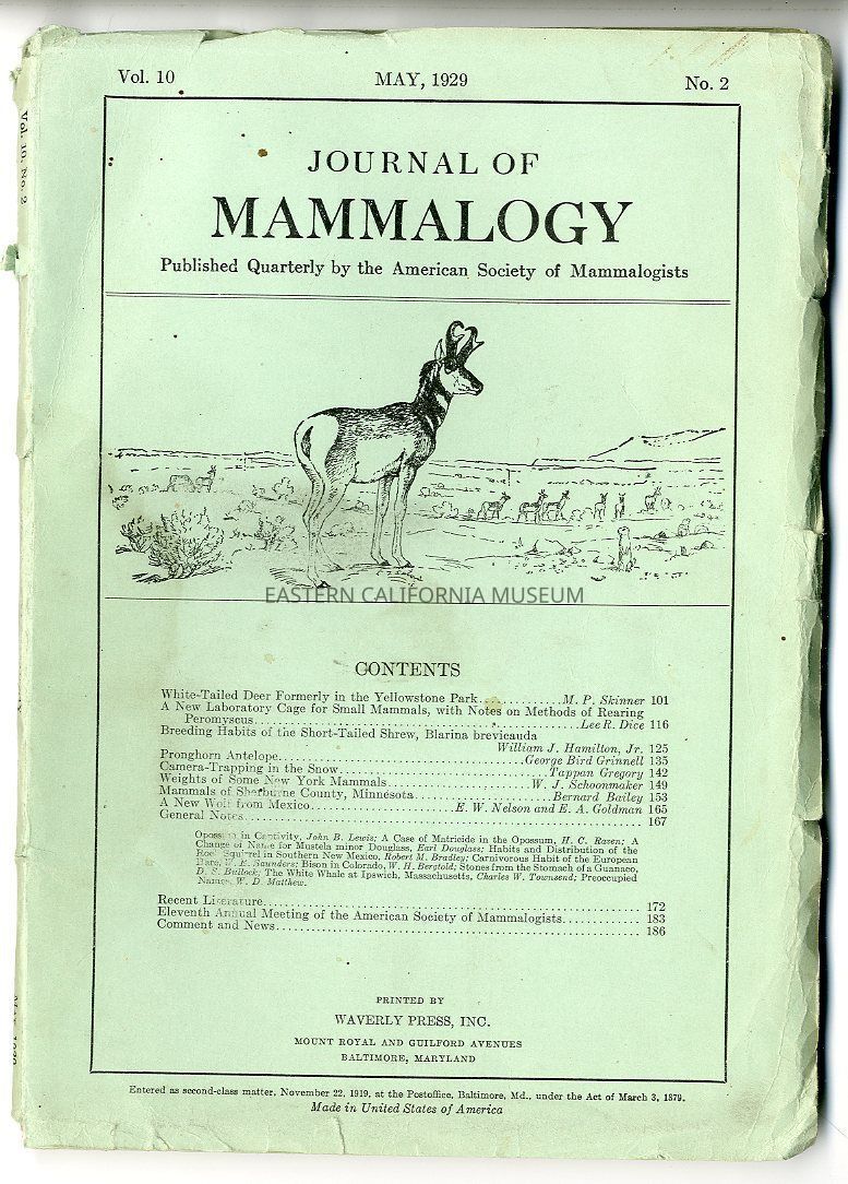 "Journal of Mammalogy, Vol. 10, No. 2, May 1929" has a detached cover.Publication Details