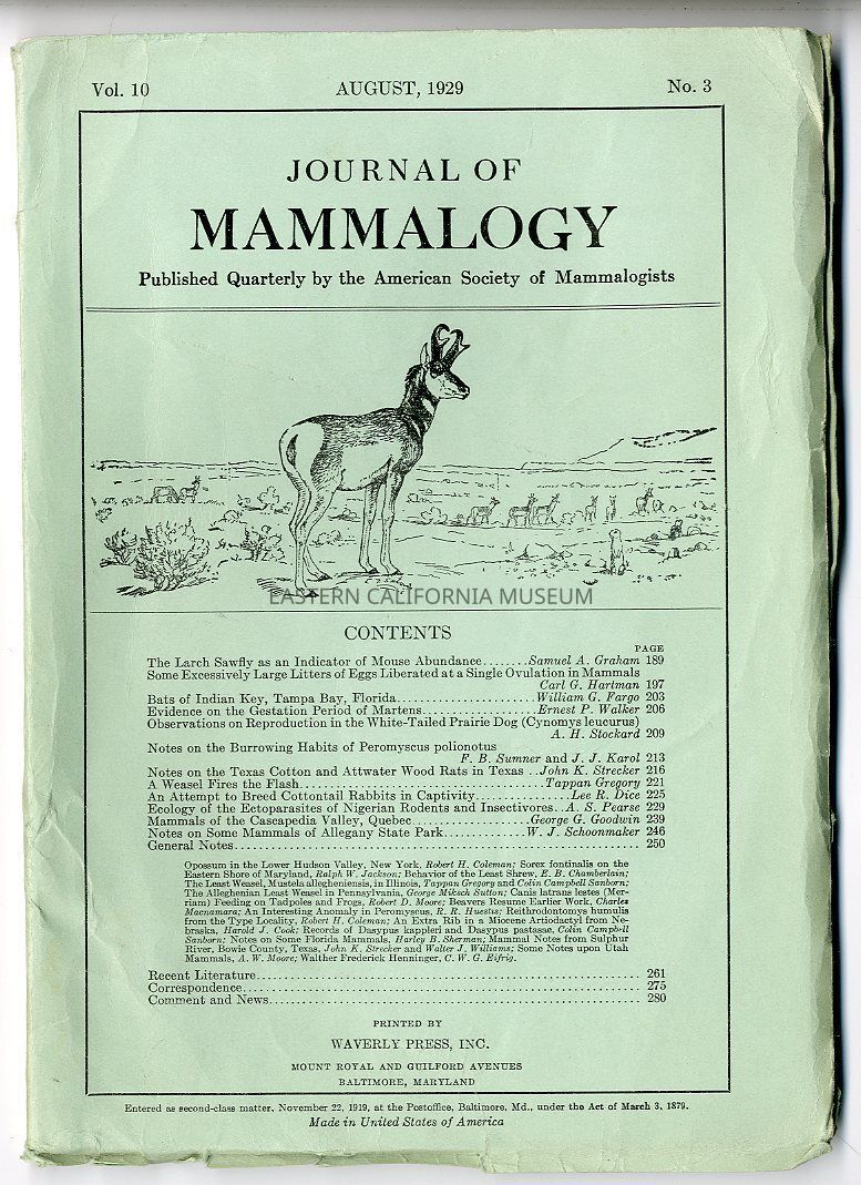 "Journal of Mammalogy, Vol. 10, No. 3, August 1929"Publication Details
