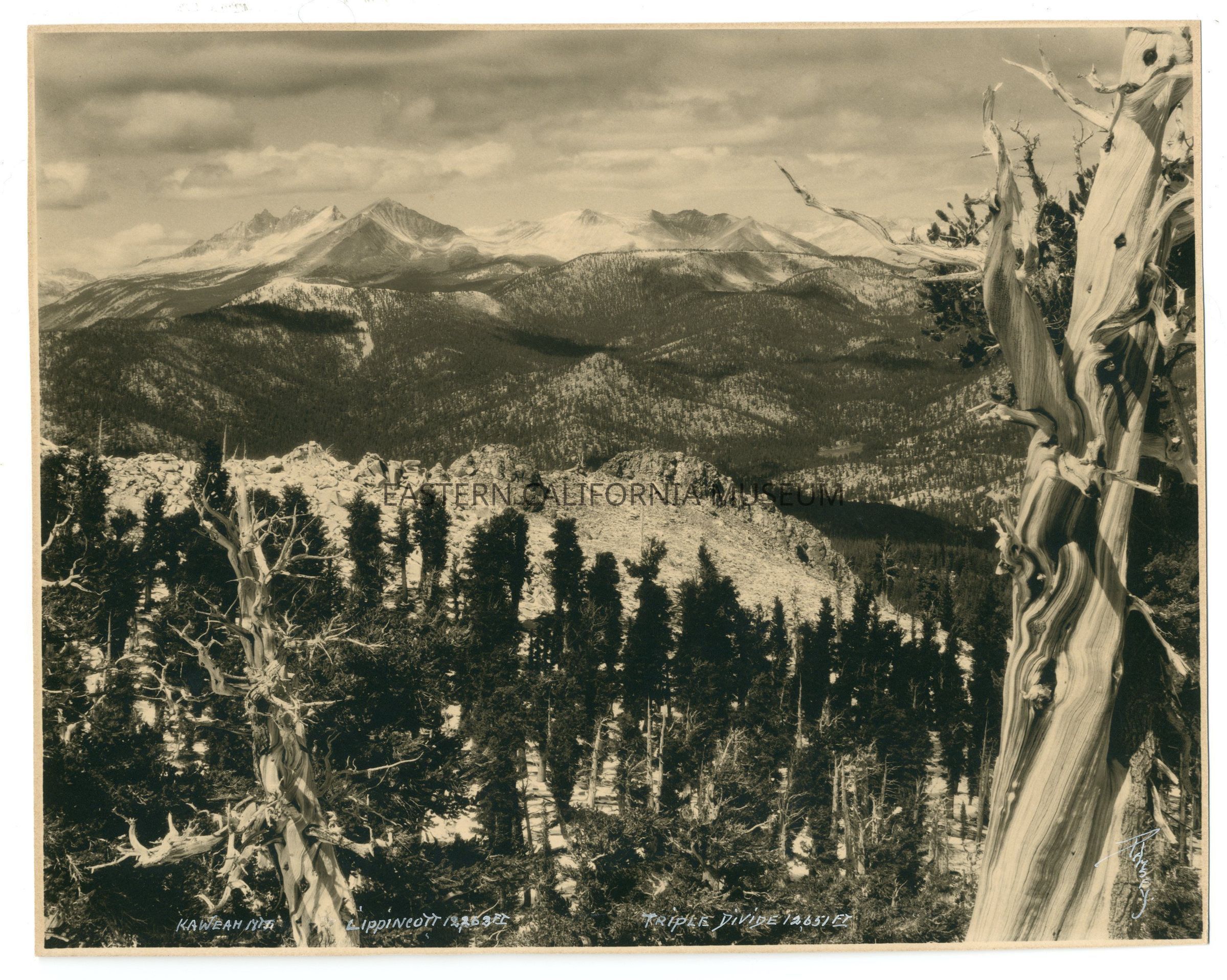 Photo of a mountain landscape with a gnarled tree in the foreground (bristlecone pine?) titled, "Kaweah Mts., Lippincott 12,263 Ft., Triple Divide 12,651 Ft." taken by photographer Allan W. Ramsey of Lone Pine.Collection