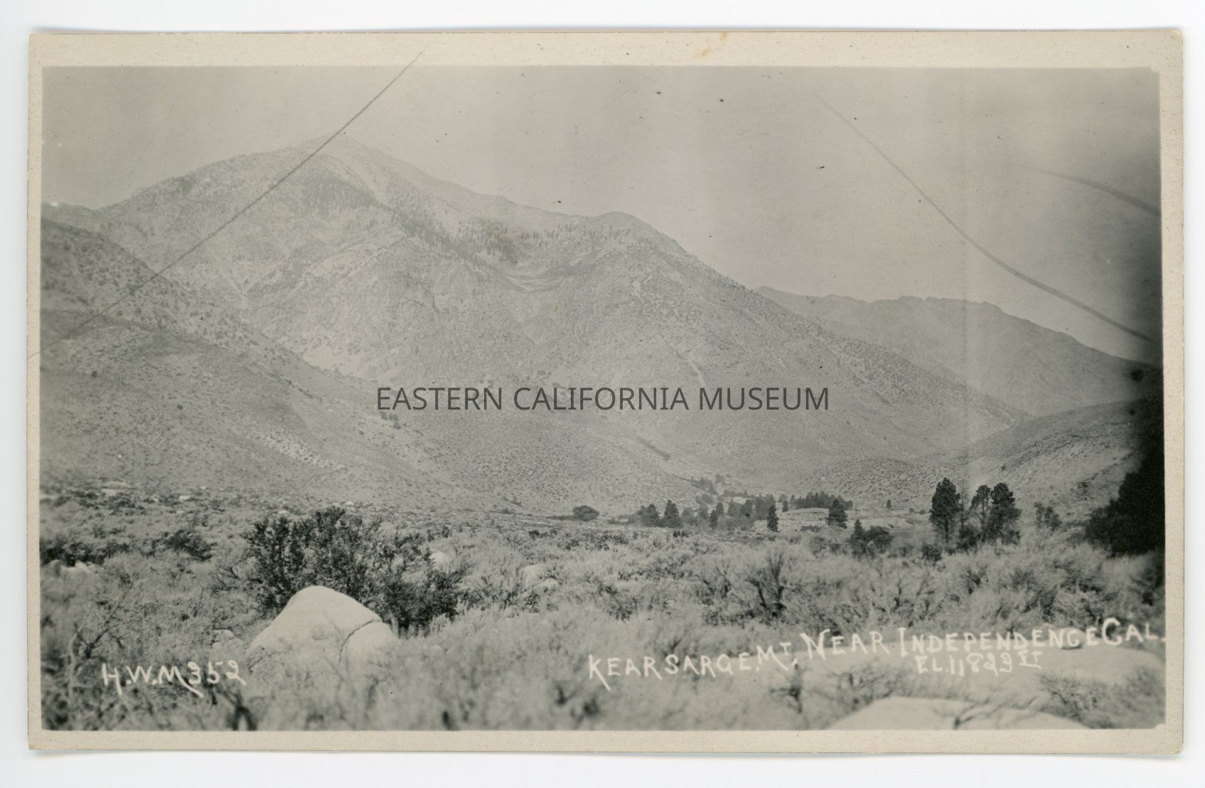 Photo postcard titled, "Kearsarge Mt. Near Independence, Cal., El. 11,823 Ft." taken by photographer H. W. Mendenhall and given his ID #352.Collection