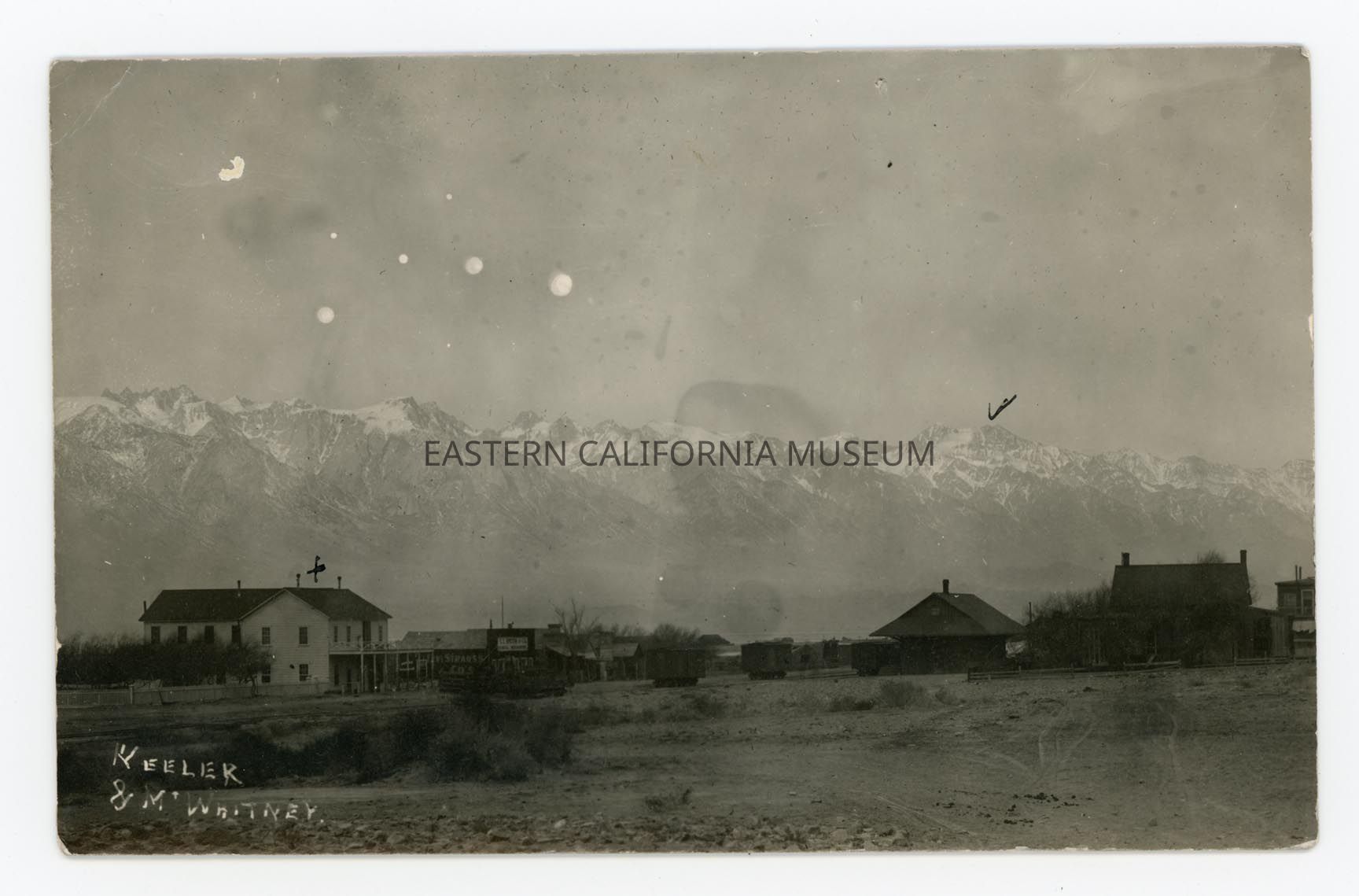 Photo postcard of the town of Keeler looking west towards the Sierra Nevada mountain range. The A. T. Smith store is visible with a Levi Strauss and Co. advertisement on the side. There appears to be a few boxcars in the center on railroad track, and it looks like the Keeler Station may be the building in the center-left. Someone has made two marks on the photo: a "+" above a two story building and a checkmark above a mountain peak. There are a few water spots or discoloration spots on the photo.