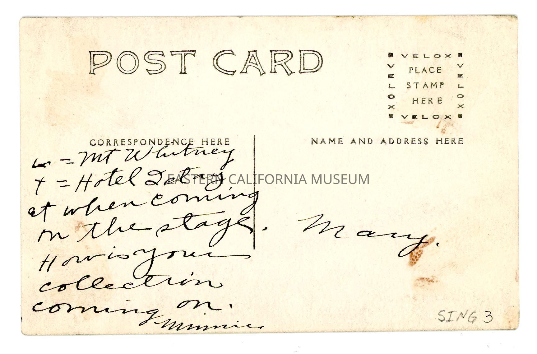 It was written from Minnie [Brooks] to Mary [Singlaub], but never mailed. In black ink she wrote, "[checkmark] = Mt. Whitney, + = Hotel I stay at when coming on the stage. How is your collection coming on. Minnie."