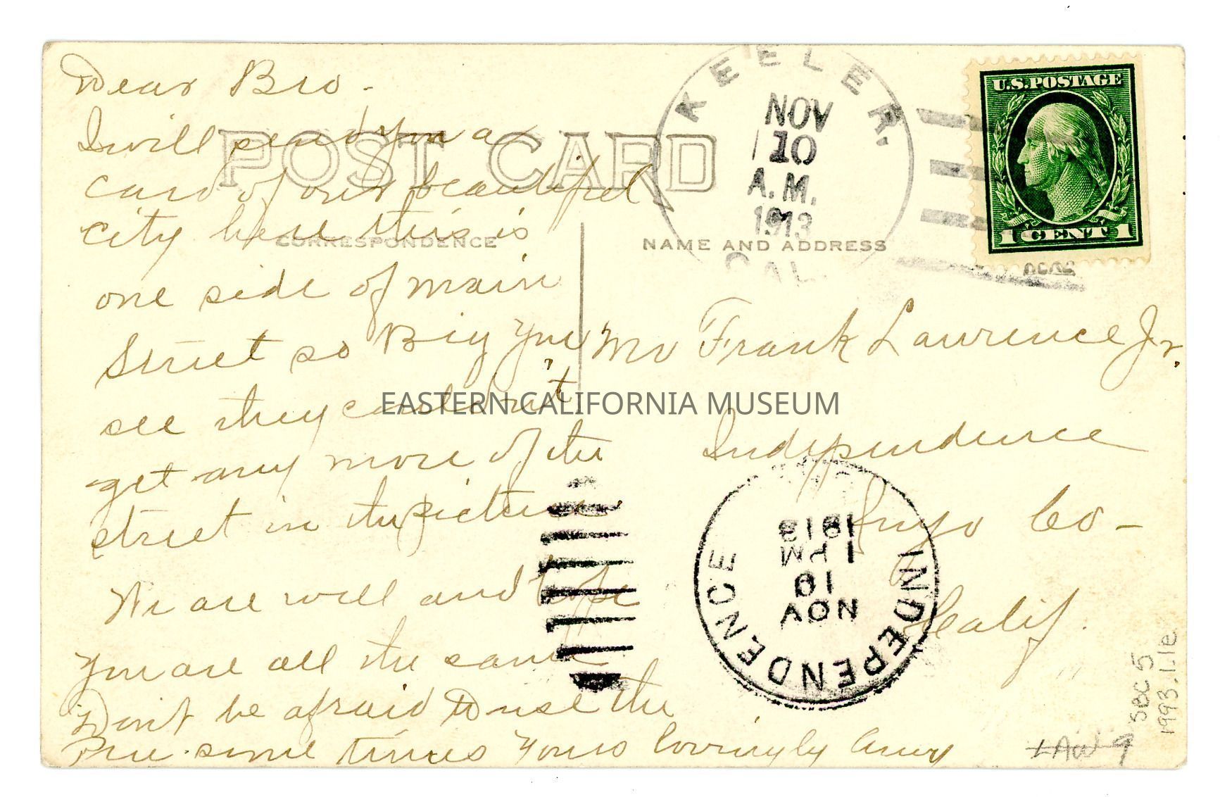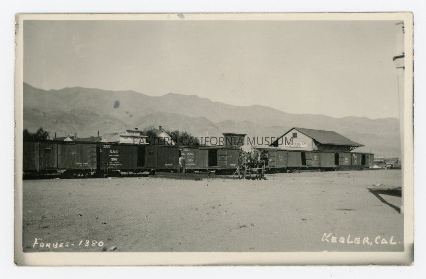 Photo postcard of N & C [Nevada and California Railway Company] boxcars in front of the A. T. Smith & Co. Warehouse and also a Meat Market in Keeler, CA. Photographer was A. A. Forbes, and it was given ID #1380. Cancellation stamps are dated November 10, 1913 in Keeler and the same date in Independence. It has a green one cent Washington stamp. The postcard was sent to Frank Laurence Jr. [Lawrence?] in Independence from his brother.Collection