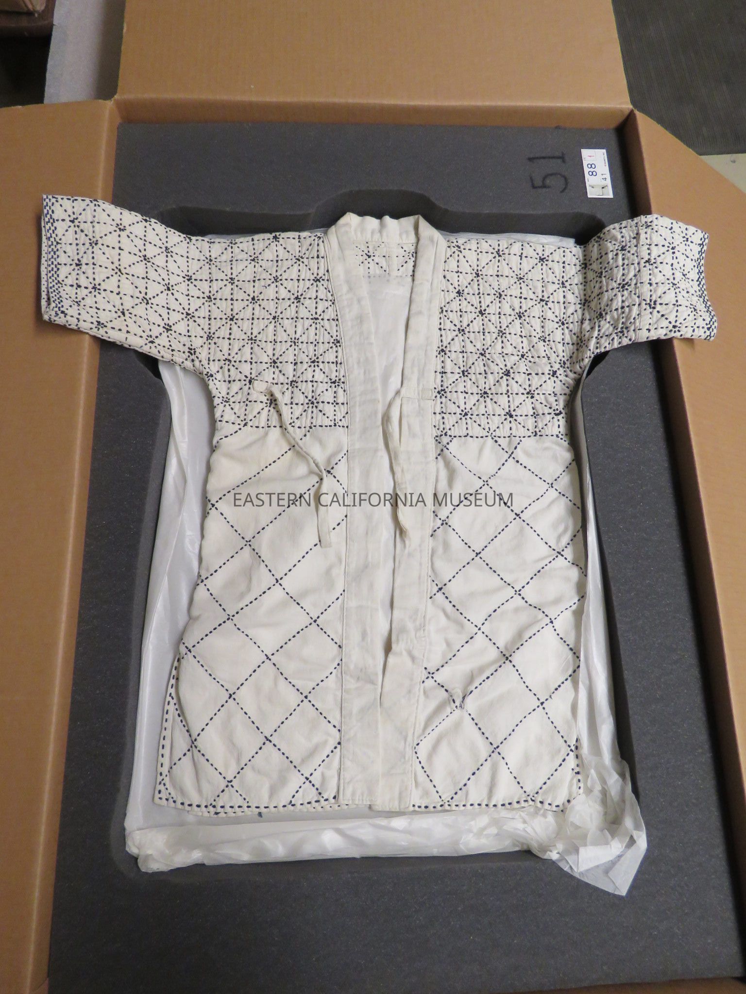 From 1994 inventory record: Kendo Gi. Made by Japanese-American at Manzanar War Relocation Center. Made of heavy unbleached muslin and black thread or string. Worn by Kendo (fencing-bamboo) participants. Has hole and is worn.Collection