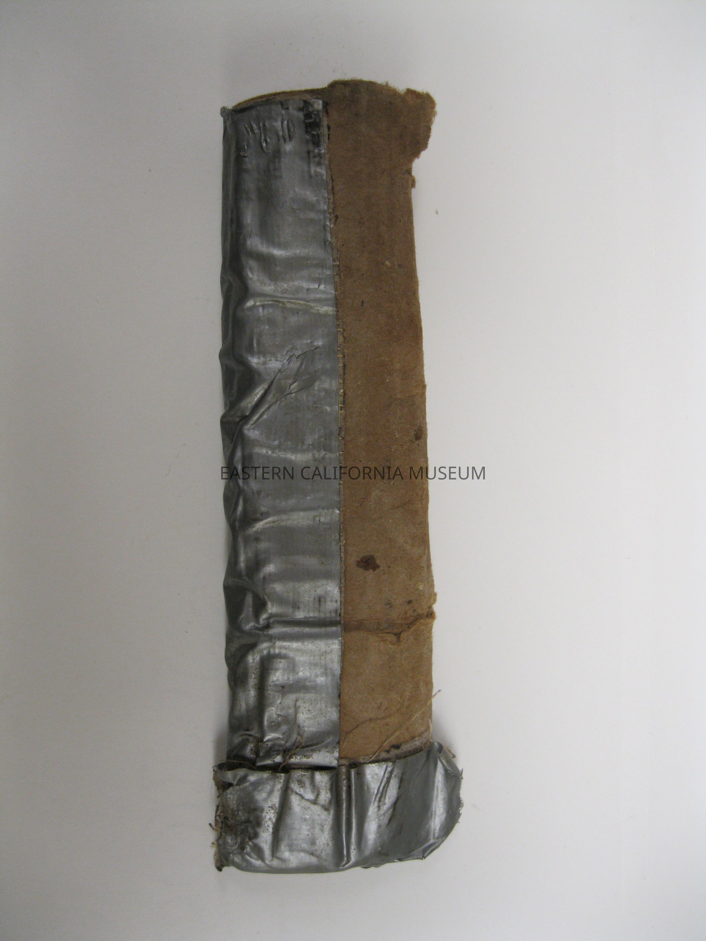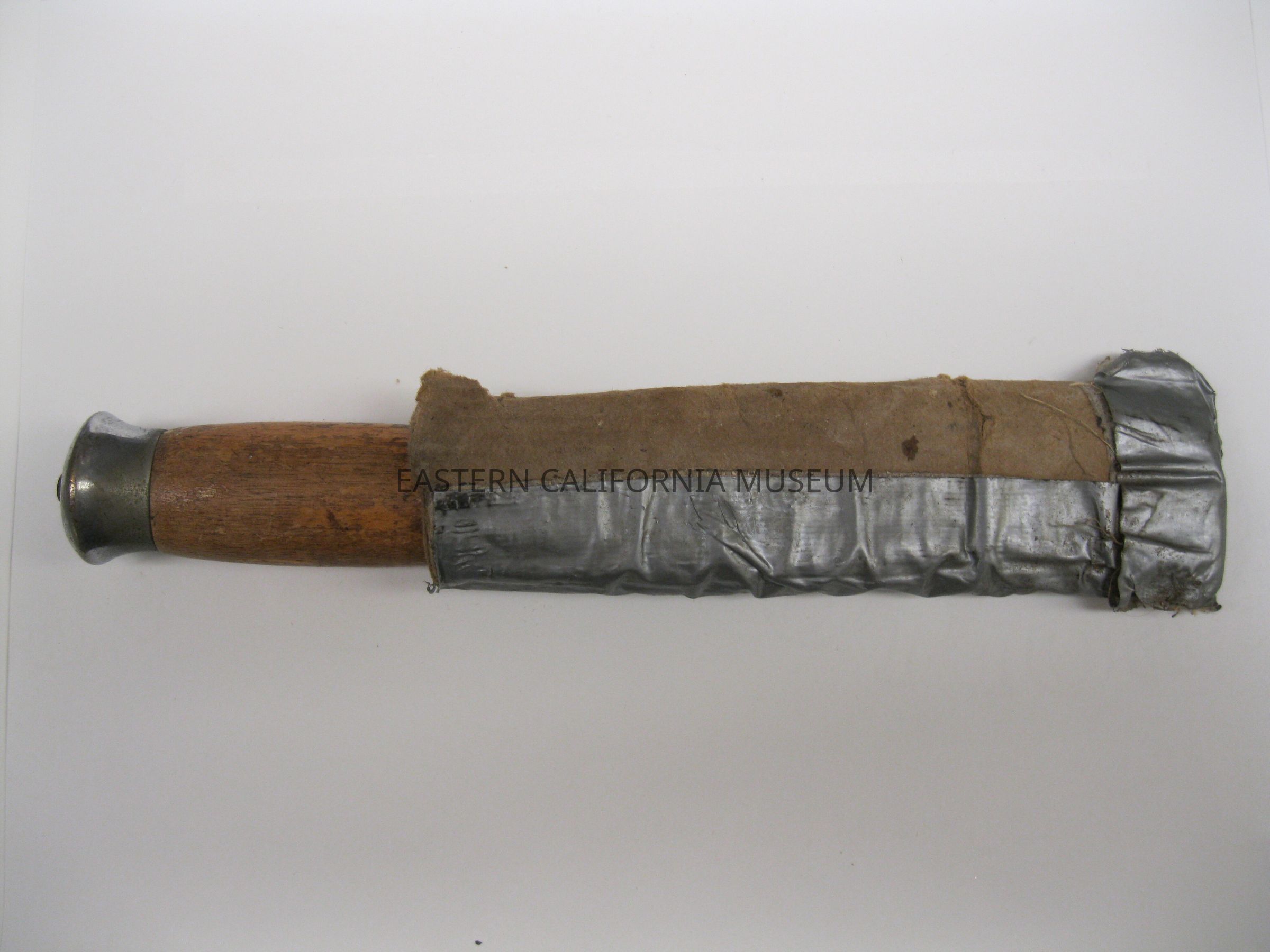 One steel knife with a wooden handle. Brand name stamped on knife is "Broderna Jonsson / Mora Sweeden." It is in a makeshift scabbard of cardboard and duck tape, which was made by the donor to protect other gear in a duffle bag.