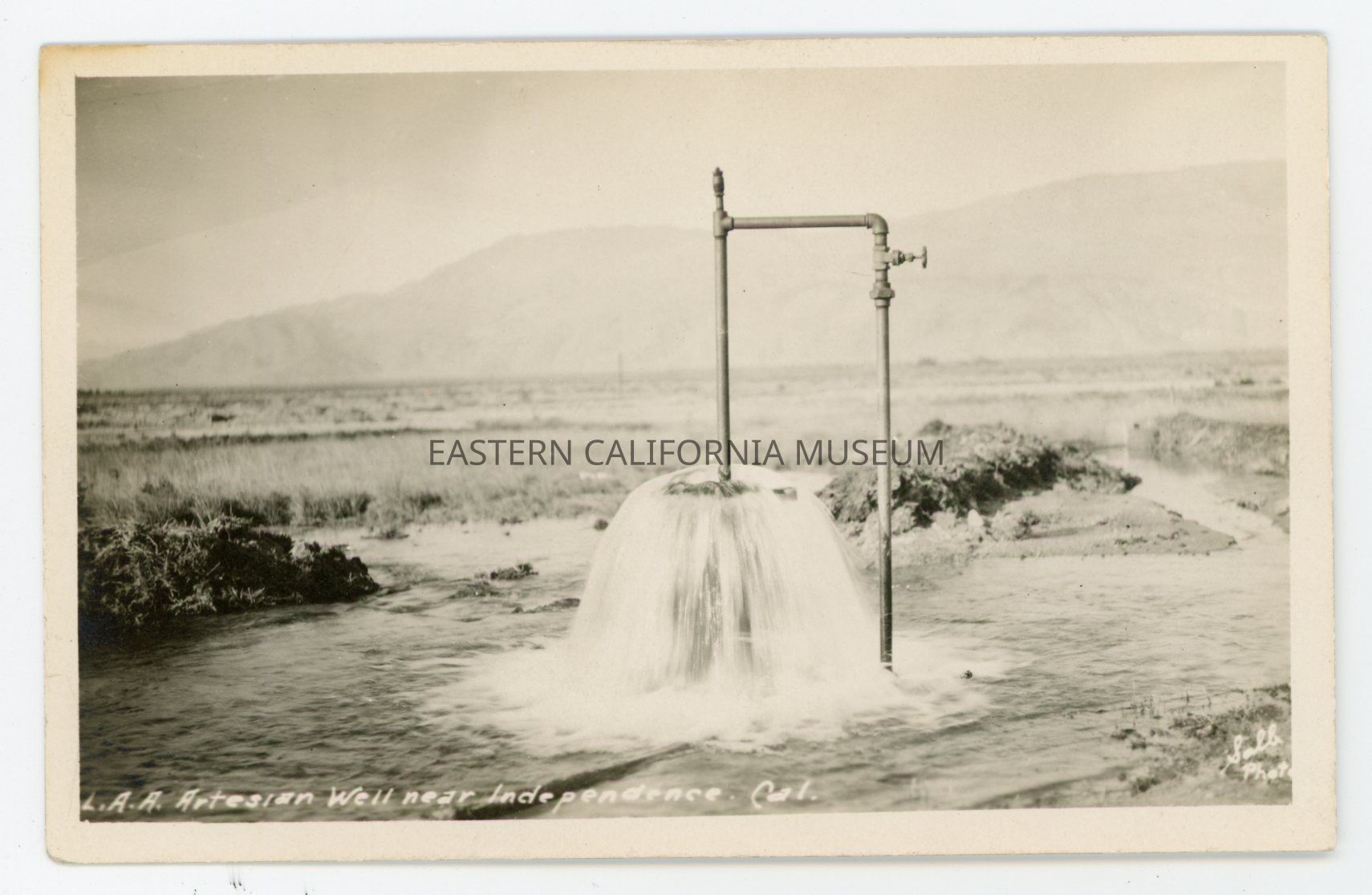 Photo postcard titled, "L.A.A. Artesian Well near Independence, Cal." It was taken by photographer Salb.Collection