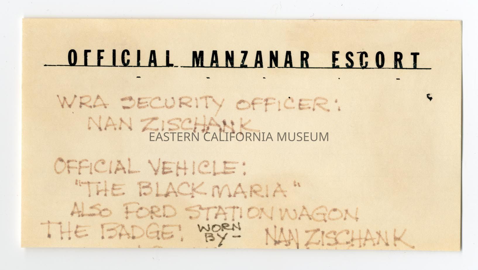 Label that says, "Official Manzanar Escort WRA Security Officer: Nan Zischank. Official Vehicle: "The Black Maria" also Ford station wagon. The badge worn by Nan Zischank."Collection