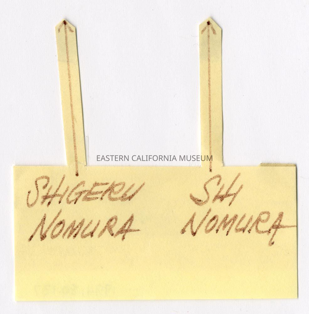 Handwritten label with two arrows that says, "Shigeru Nomura, Shi Nomura."