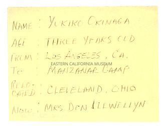 Handwritten label that says: Name: Yukiko Okinaga. Age: Three years old. From: Los Angeles, CA. To: Manzanar Camp. Relocated: Cleveland, Ohio. Now: Mrs. Don Llewellyn.Collection