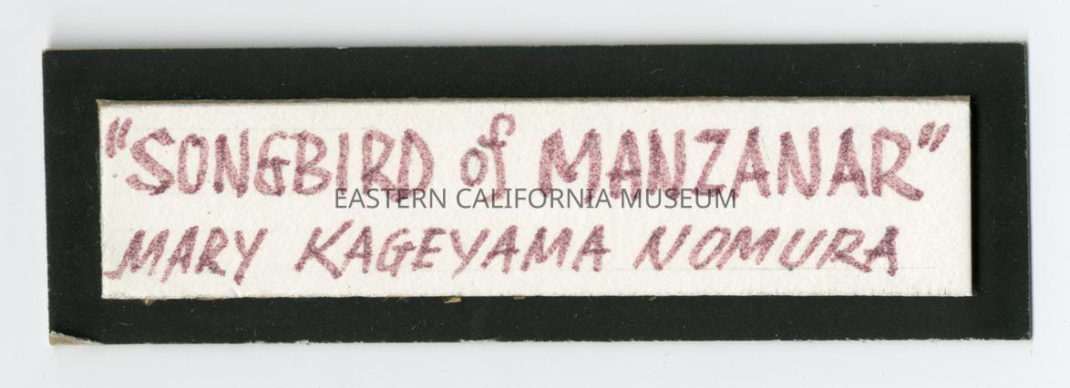 Handwritten label that says: "Songbird of Manzanar" Mary Kageyama Nomura.