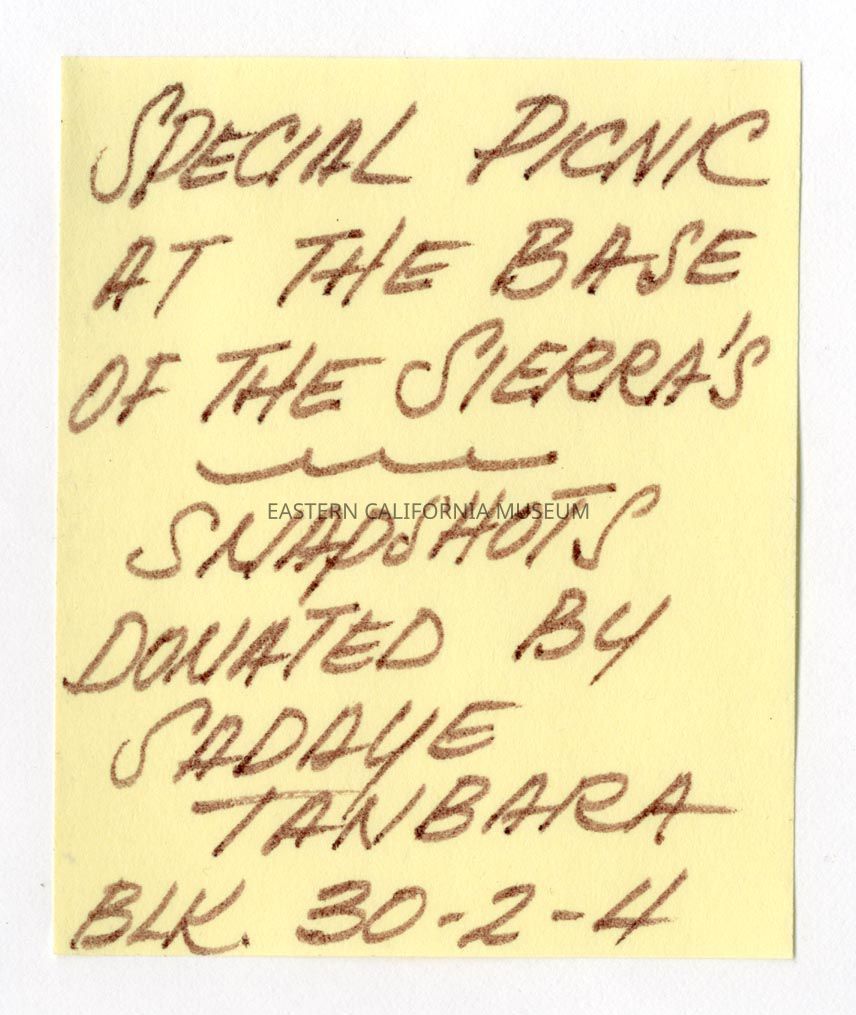Handwritten label that says, "Special picnic at the base of the Sierra's. Snapshots donated by Sadaye Tanbara, Blk. 30-2-4."