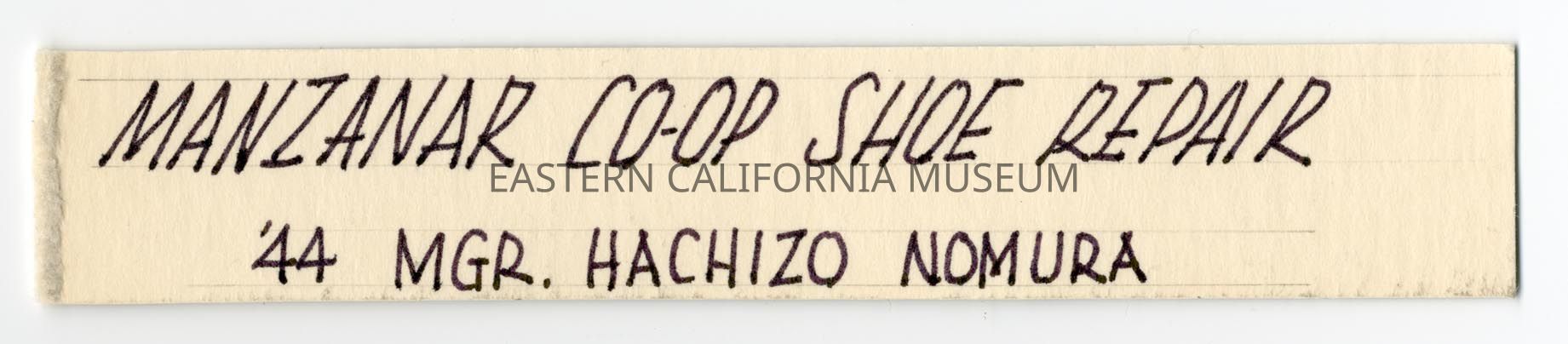 Handwritten label that says, "Manzanar Co-Op Shoe Repair, '44 Mgr. Hachizo Nomura."