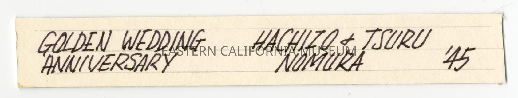 Handwritten label that says, "Golden Wedding Anniversary, Hachizo + Tsuru Nomura, '45."