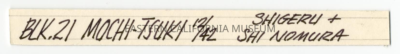 Handwritten label that says, "Blk. 21 Mochi-Tsuki 12/42 [December 1942], Shigeru + Shi Nomura."