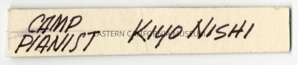 Handwritten label that says, "Camp Pianist Kiyo Nishi."