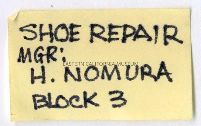 Handwritten label that says, "Shoe Repair Mgr. H. Nomura, Block 3."