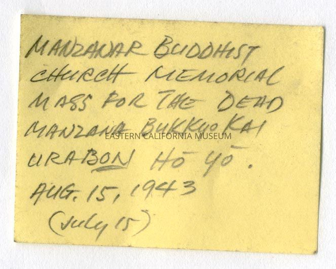 Handwritten label that says, "Manzanar Buddhist Church Memorial Mass for the Dead, Manzanar Bukkyo Kai Urabon Ho Yo, Aug. 15, 1943 (July 15)."