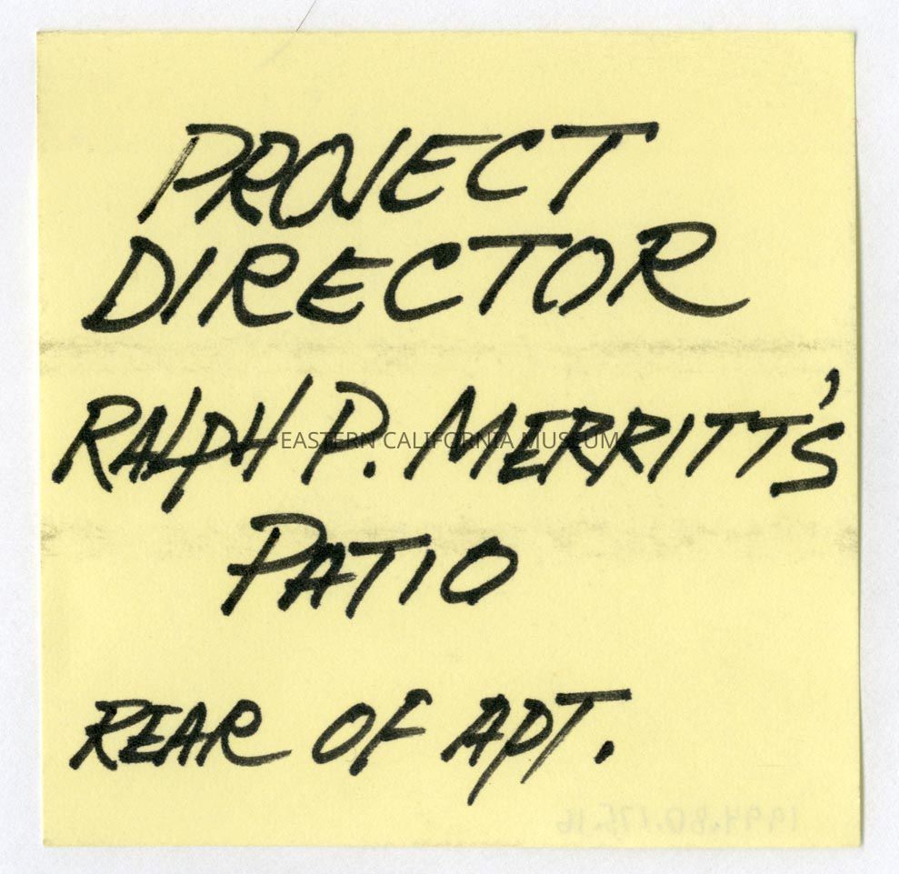 Handwritten label that says, "Project Director Ralph P. Merritt's Patio, rear of apt."