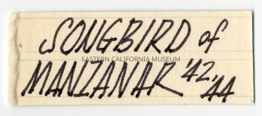 Handwritten label that says, "Songbird of Manzanar '42 '44."