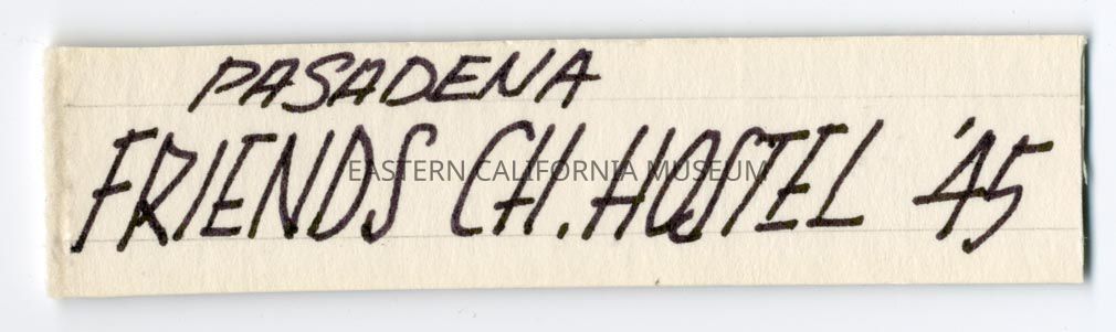 Handwritten label that says, "Pasadena Friends Ch. Hostel '45."