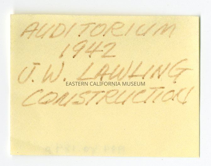 Handwritten label that says, "Auditorium 1942 J. W. Lawling [Lawing] Construction."