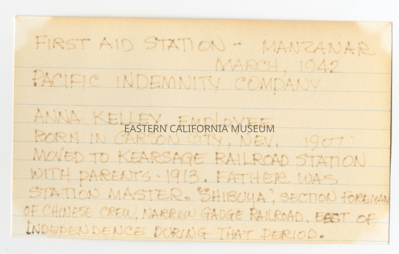 Handwritten label that says, "First Aid Station, Manzanar, March 1942, Pacific Indemnity Company. Anna Kelley, Employee. Born in Carson City, Nev. 1907, moved to Kearsarge Railroad Station with parents 1913. Father was Station Master. "Shibuya" Section Foreman of Chinese Crew, narrow gauge railroad. East of Independence during that period."Collection