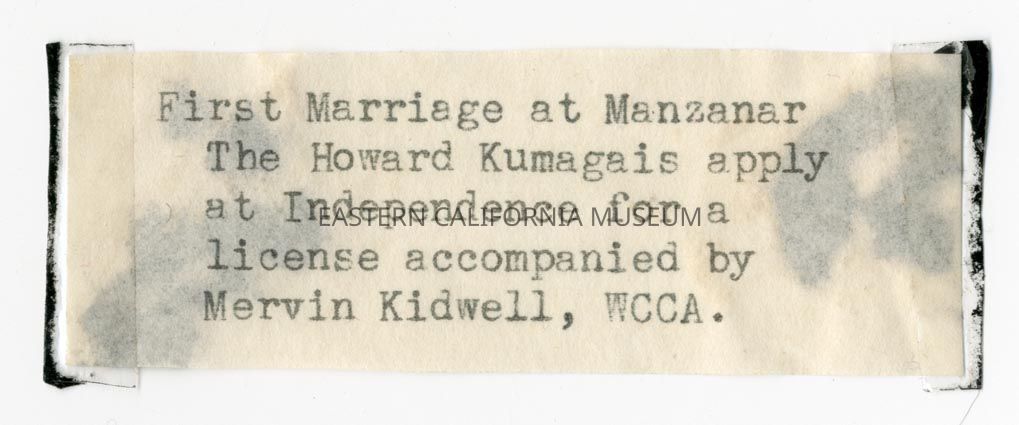 Typewritten label that says, "First marriage at Manzanar. The Howard Kumagais apply at Independence for a license accompanied by Mervin Kidwell, WCCA."