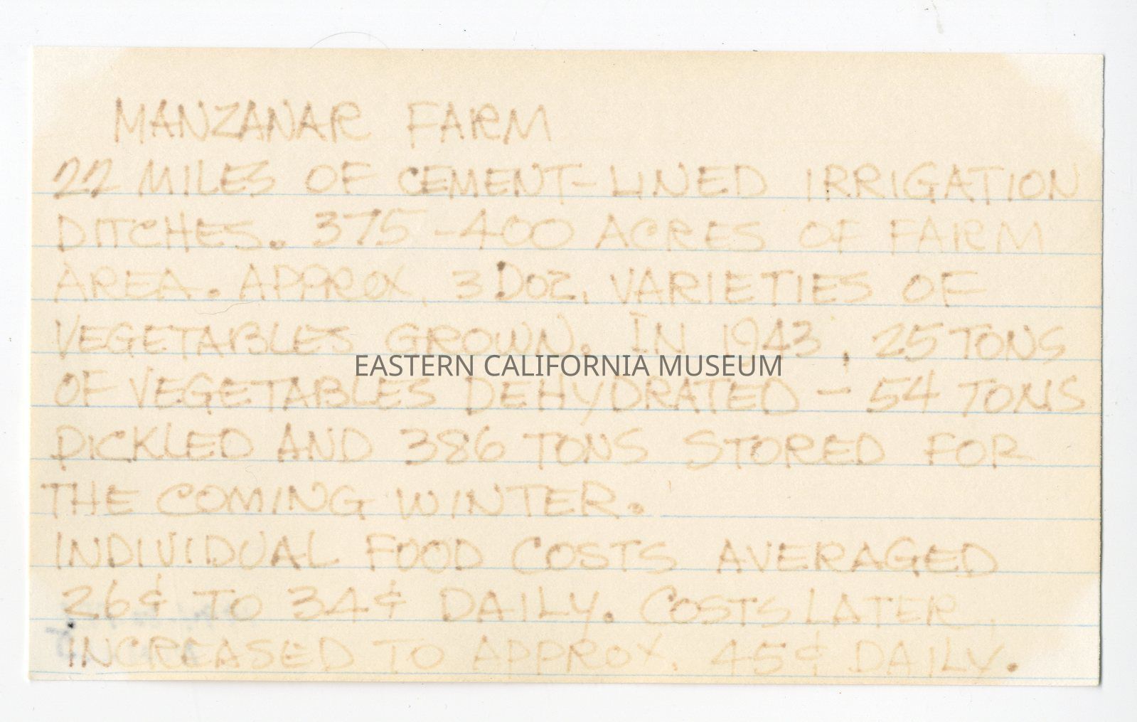 Label that says, "Manzanar Farm. 22 miles of cement-lined irrigation ditches. 375-400 acres of farm area. Approx. 3 doz. varieties of vegetables grown. In 1943, 25 tons of vegetables dehydrated--54 tons pickled and 86 tons stored for the coming winter. Individual food costs averaged 26 cents to 34 cents daily. Costs later increased to approx. 45 cents daily."Collection