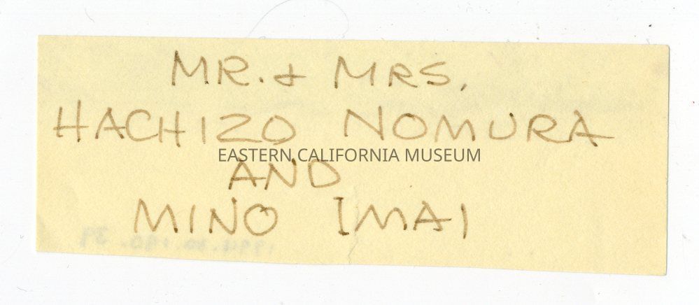 Handwritten label that says, "Mr. + Mrs. Hachizo Nomura and Mino Imai."