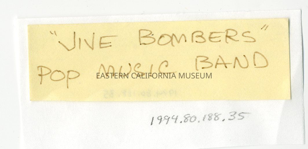Handwritten label that says, "'Jive Bombers' Pop Music Band."
